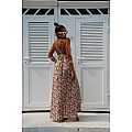 Abito lungo a schiena nuda in cotone; fantasia “Noa Noa”; allacciatura al collo o sulla schiena con fettuccia in lycra multi-color intrecciata a mano; raffinato nastro sotto petto in macramé.