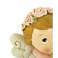 Angelo che prega con luce LED, orli e fiori rosa, in resina, 15 cm