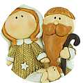 Il soprammobile natalizio, in resina colorata, rappresenta una piccola scena con Giuseppe, Maria e Gesù Bambino. Madre e padre fanno da sfondo alla culla con il Bambino. La piccola Sacra Famiglia misura 10 cm d'altezza e 8 cm di larghezza. Lo spessore contenuto rende questa graziosa decorazione natalizia perfetta anche per piccoli spazi quali comodini o piccole mensole. Lo stile dei personaggi, caratterizzato da volti paffuti, ricorda un po' le raffigurazioni dei cartoni animati e fa sì che la piccola natività sia un regalo ideale per bambini o per alunni del catechismo.