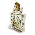 Il piccolo quadretto in resina bianca rappresenta un angioletto sopra a una finestra aperta. All'interno, sono raffigurati la Madonna con le mani conserte in segno di preghiera e il Bambino nella culla.