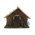 Capanna con lanterna e Natività. Alimentazione a batteria. Dimensioni: 16 x 10 x 14 cm. Materiali: legno, sughero e plastica. Realizzato artigianalmente in Italia.