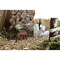 Capanna con fuoco elettrico (simulato tramite lampadina effetto fuoco alimentata a 200V). Ideale per statuine da 10/12 cm. Altre caratteristiche: recinto per animali. Dimensioni: 56 x 21 x 25 cm. Materiali: Legno, Sughero, Muschio e Paglia. Realizzato artigianalmente in Italia.