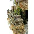 Accessori per presepe: Casa In Stucco Con Rimessa di Legna. Dimensioni: 13 x 25 x 19 cm. Materiali: legno, muschio, sughero, stucco e lichene. Realizzato artigianalmente in Italia.
