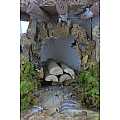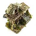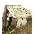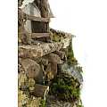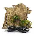 Accessori per presepe: Casa di campagna con fuoco elettrico (alimentazione elettrica 220 V). Dimensioni: 16 x 22 x 18 cm. Materiali: legno, stucco, sughero, cartone e muschio. Realizzato artigianalmente in Italia.
