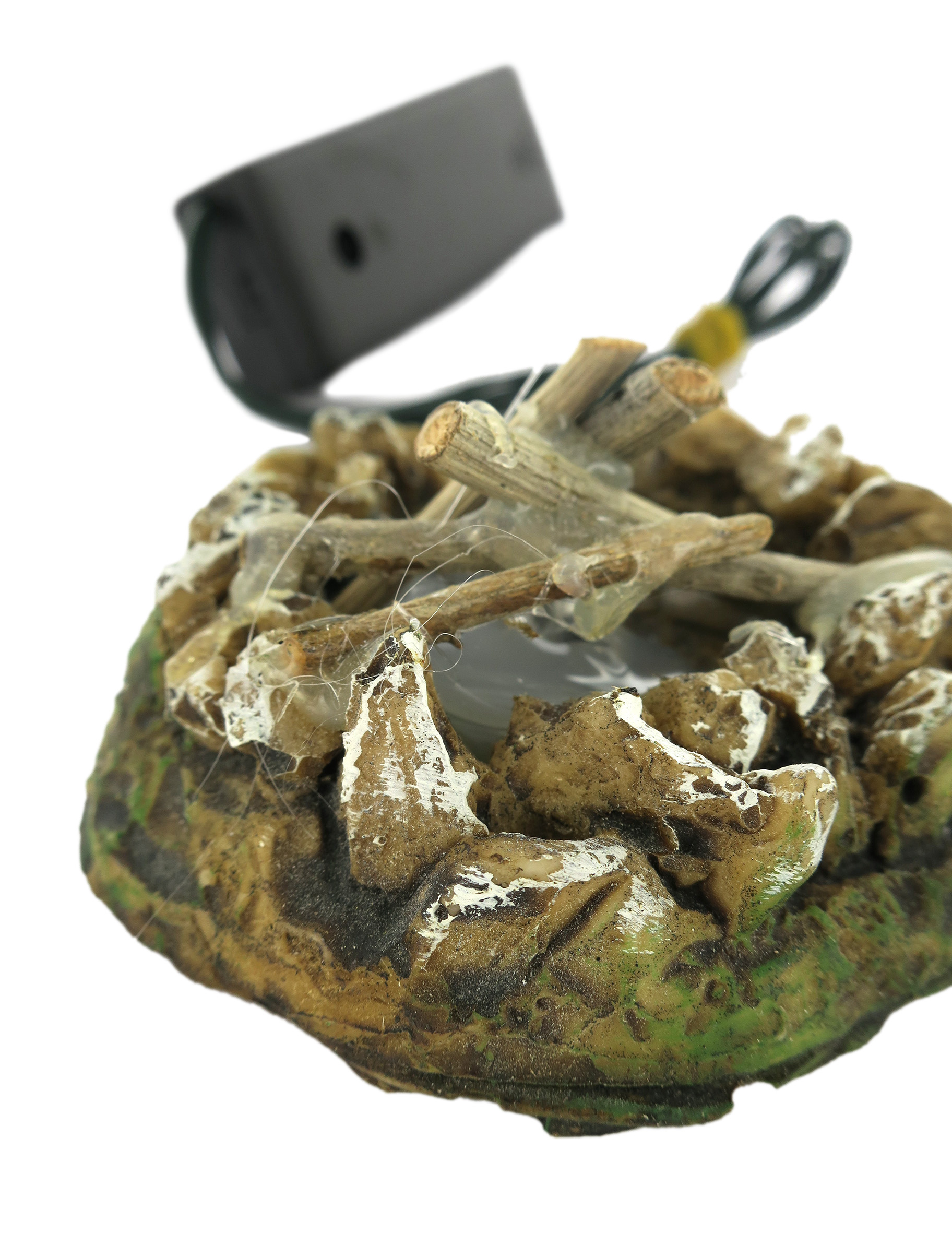 Accessori per presepe: Bivacco in resina con fuoco a LED. Dimensioni: 7 x 8 x 4 cm. Realizzato artigianalmente in Italia.