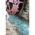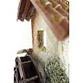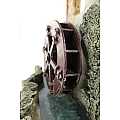 Accessori per presepe: Mulino con ruota che gira, alimentazione elettrica 220V. Il mulino è su un tratto di fiume.