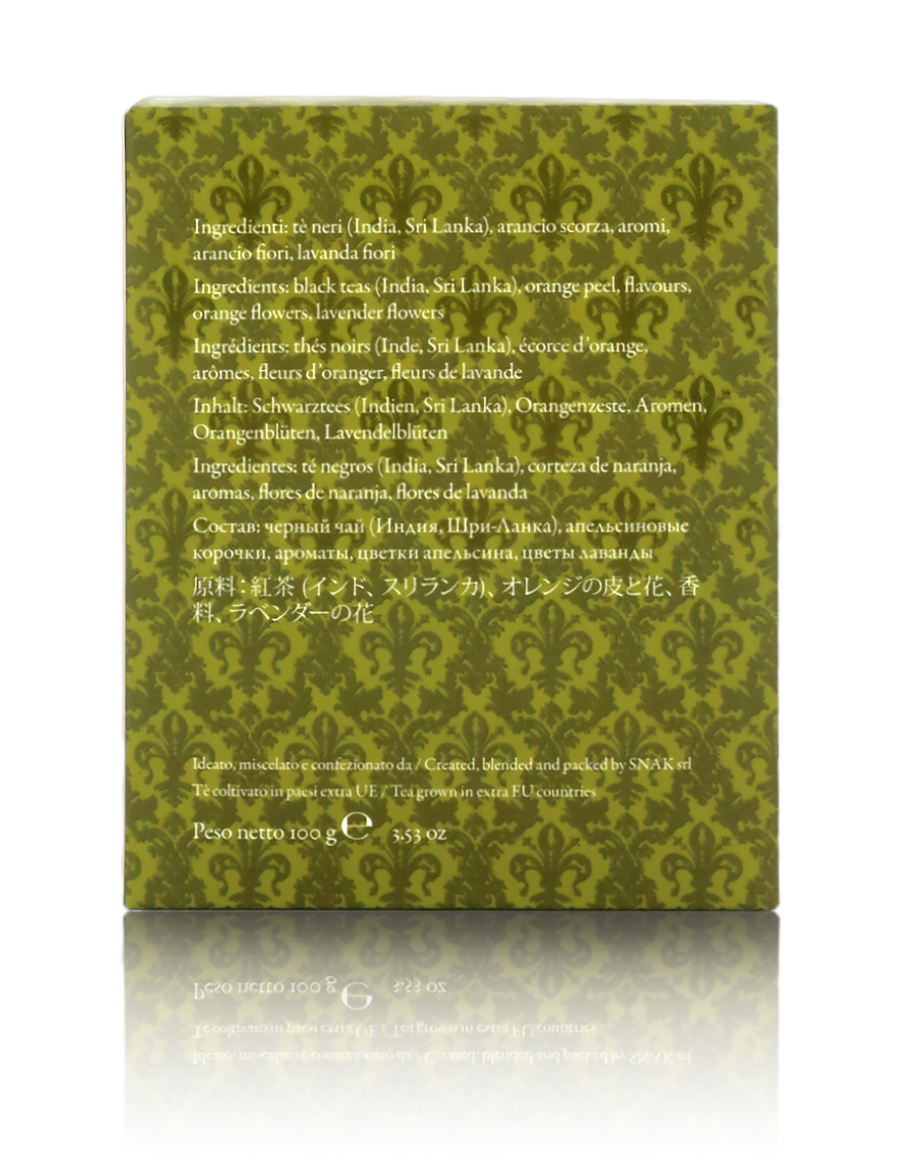 Ingredienti: Tè nero indiano, tè nero, aromi, scorza d'arancia, fiori d'arancio, lavanda.