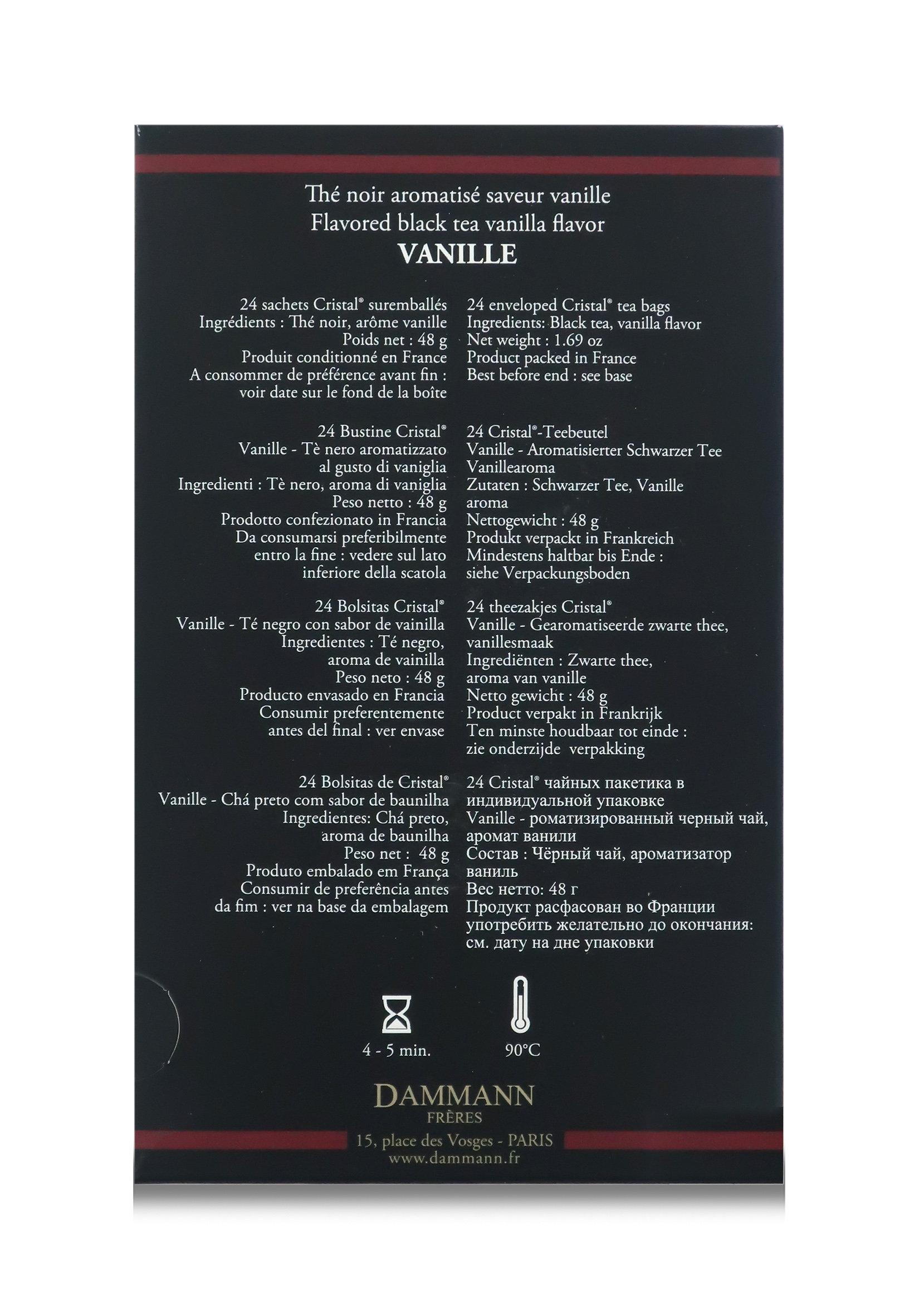 Il tè nero Vanille è contenuto in esclusive e pratiche bustine "Cristal" incartate singolarmente.