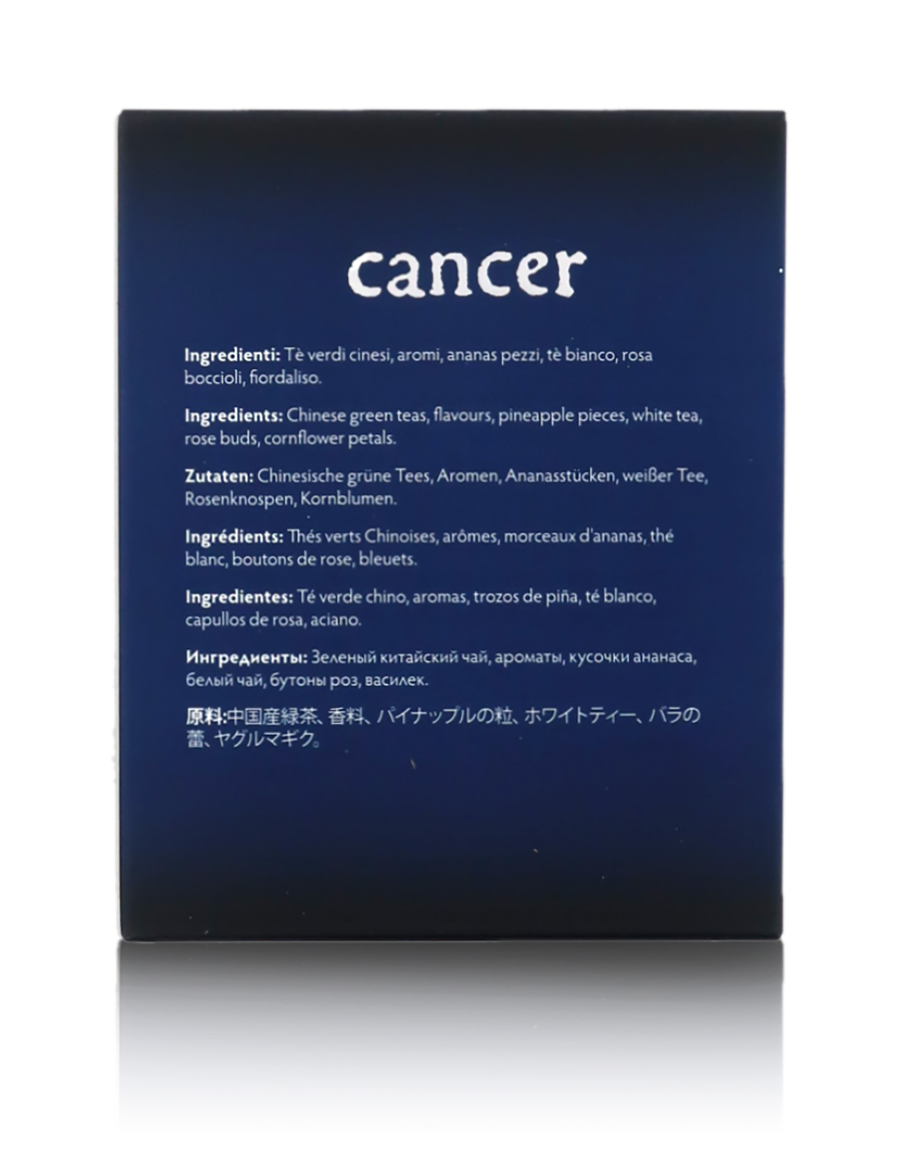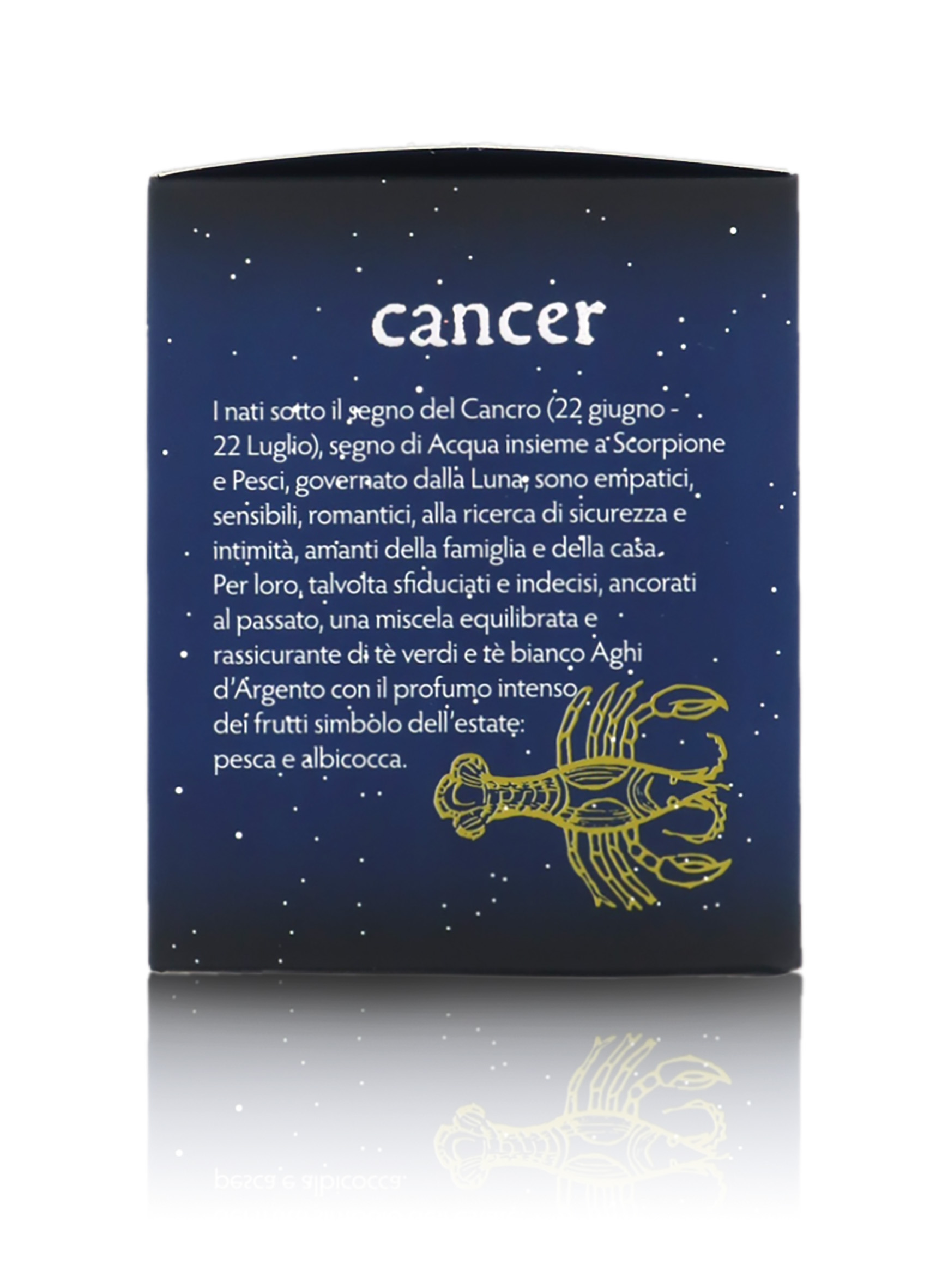 Miscela sfusa di tè verde e bianco (aghi d'argento), piacevolmente profumata, dedicata al segno del Cancro (segno di acqua, come lo Scorpione e i Pesci). i nati sotto il segno del Cancro (22 Giugno - 22 Luglio) sono governati dagli influssi della Luna e risultano empatici, sensibili e romantici.