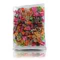 Sacchetto da 500g di caramelle gelatinose alla frutta, gusti assortiti (amarena, fragola, lampone, limone, arancia e cedro), incartate singolarmente. Prive d'ingredienti di origine animale (latte, grassi e gelatina). Senza glutine e soia.