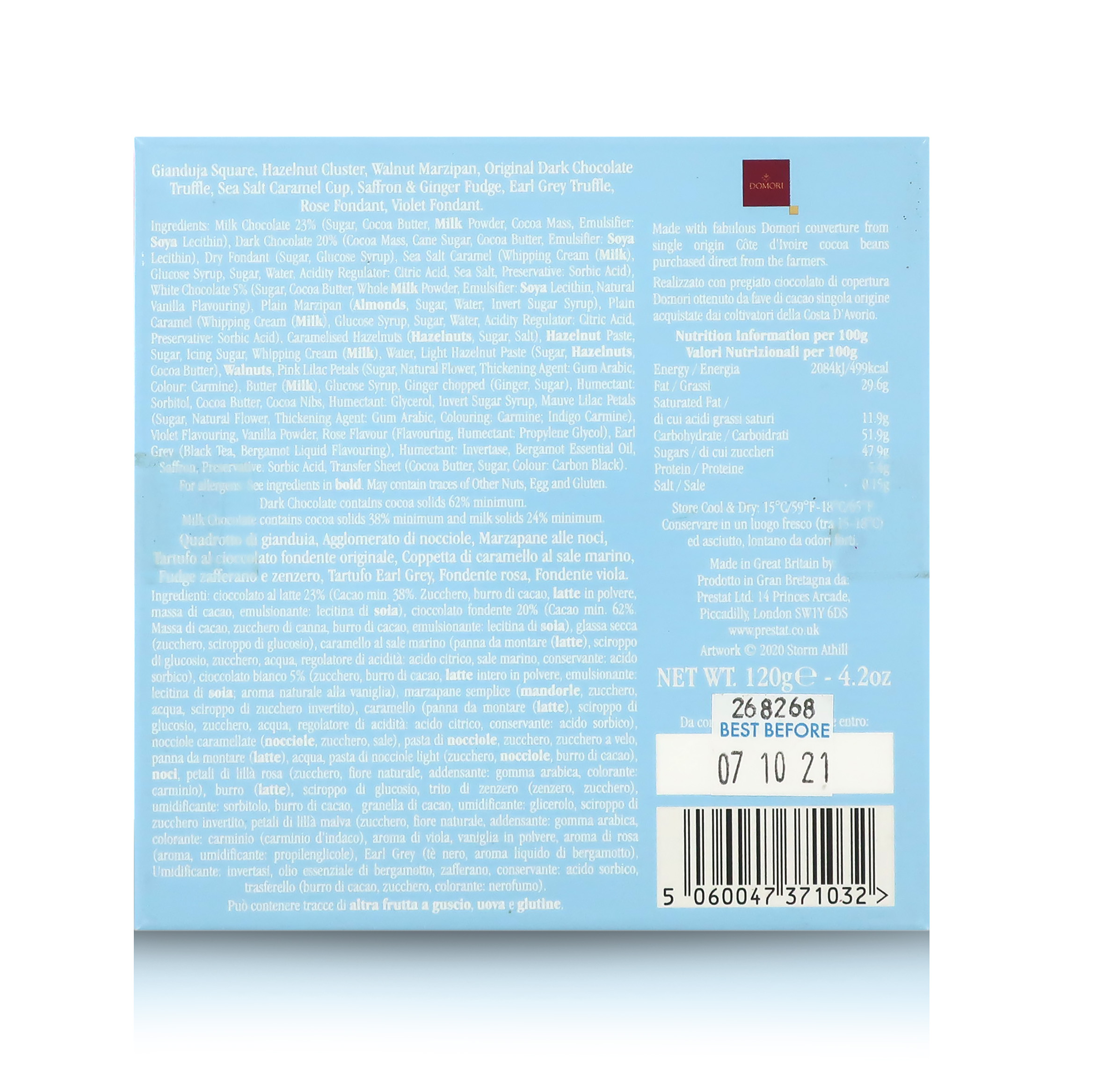 Cofanetto quadrato di color rosa, dalle tinte accese, che racchiude 9 praline assortite: Quadrotto di gianduia / Agglomerato di nocciole / Marzapane alle noci / Tartufo al cioccolato fondente originale / Coppetta di caramello al sale marino / Fudge zafferano e zenzero / Tartufo al tè Earl Grey / Fondente alla rosa / Fondente alla violetta. La Jewel Box è tra i pezzi forti dello sfarzoso assortimento Prestat. Questa confezione particolare è ispirata alla scatola di cioccolatini personale della Regina Vittoria, regolarmente rifocillata dai collaboratori delle Cucine Reali. La finissima selezione comprende 9 praline di cioccolato gourmet, la cui copertura è realizzata con pregiatissimo cioccolato Domori Single Origin.