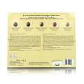 20 sfere artigianali con morbido ripieno, in scatola regalo di design. Gusti presenti: (a) cioccolato fondente con ripieno al cacao, (b) cioccolato al latte con ripieno alla nocciola, (c) cioccolato biondo gold con ripieno al caramello, (d) cioccolato rosa Ruby con ripieno allo yogurt, (e) cioccolato bianco con ripieno al cocco.