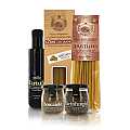 2 confezioni di Pasta Morelli al tartufo (250g per conf.); olio extra vergine d'oliva Ursini aromatizzato al tartufo bianco (250 ml); Pestato Tartufunghi Ursini - pâté di funghi e tartufo con olio extra vergine d'oliva (170 g); Sugo Boscaiolo - condimento ai funghi (170 g).