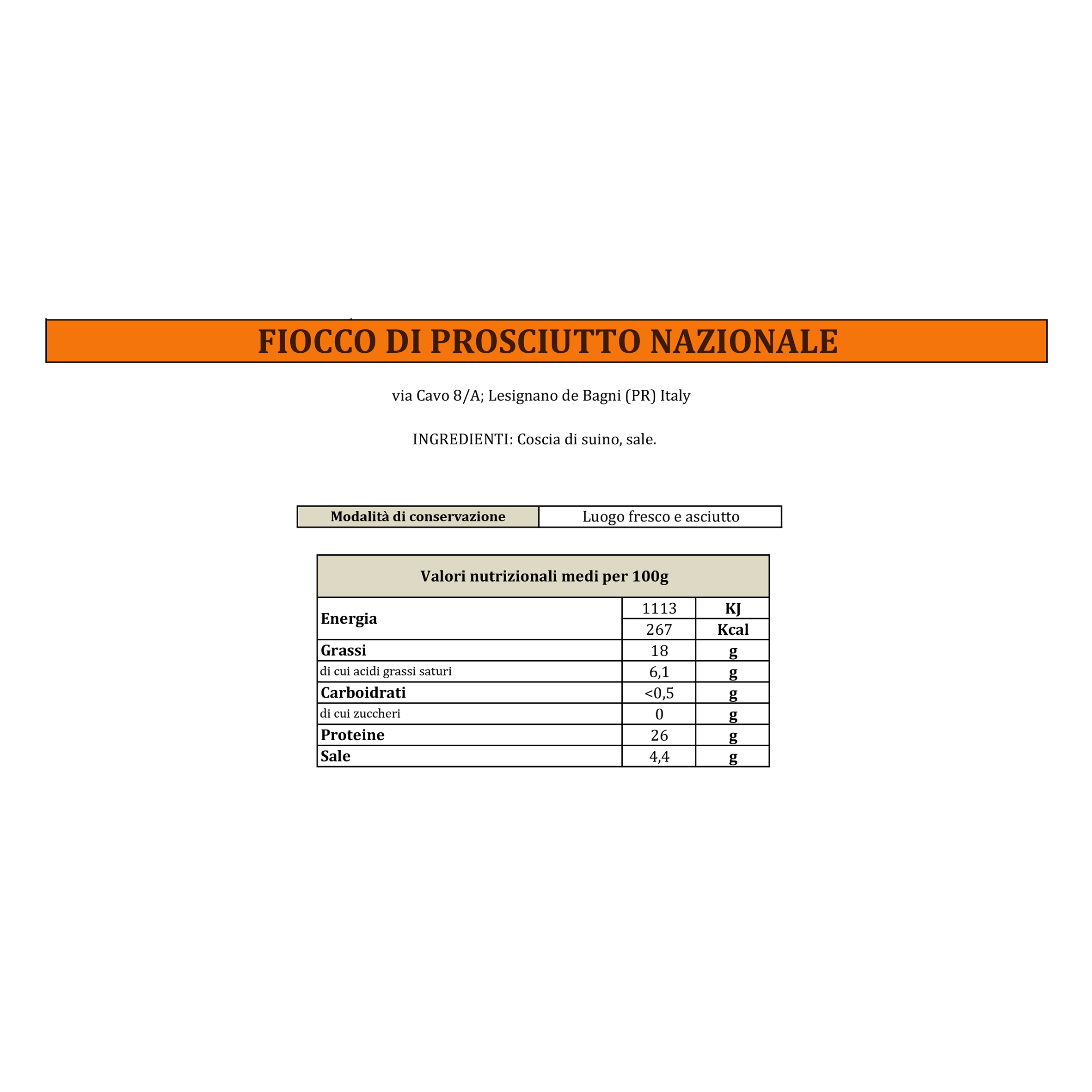 Modalità di conservazione: Luogo fresco e asciutto. Coscia di suino Origine: Italia.
