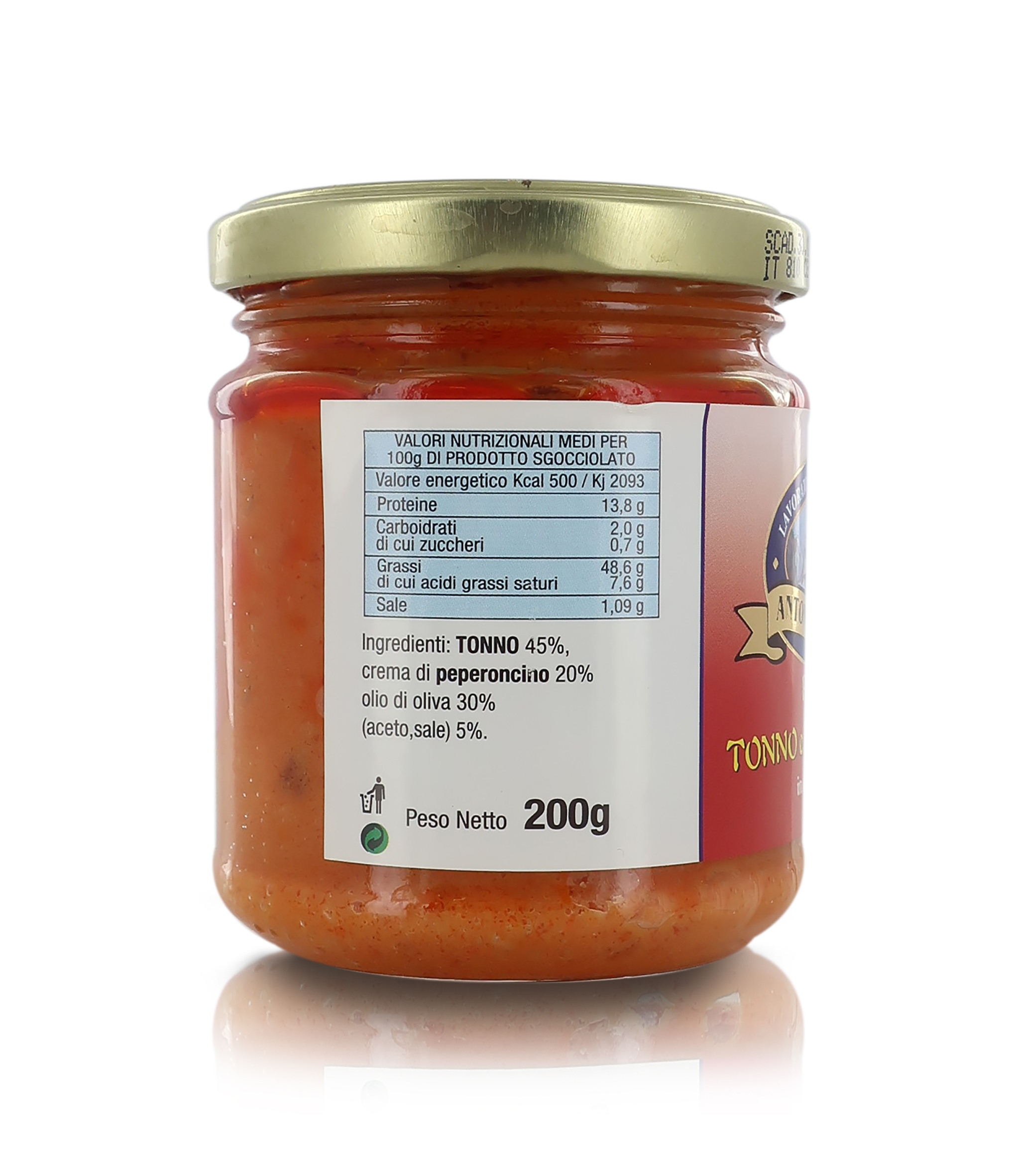 Ingredienti: TONNO, crema di PEPERONCINO, olio extravergine di oliva, aceto, sale marino. Riporre in frigo dopo l’apertura del vasetto.