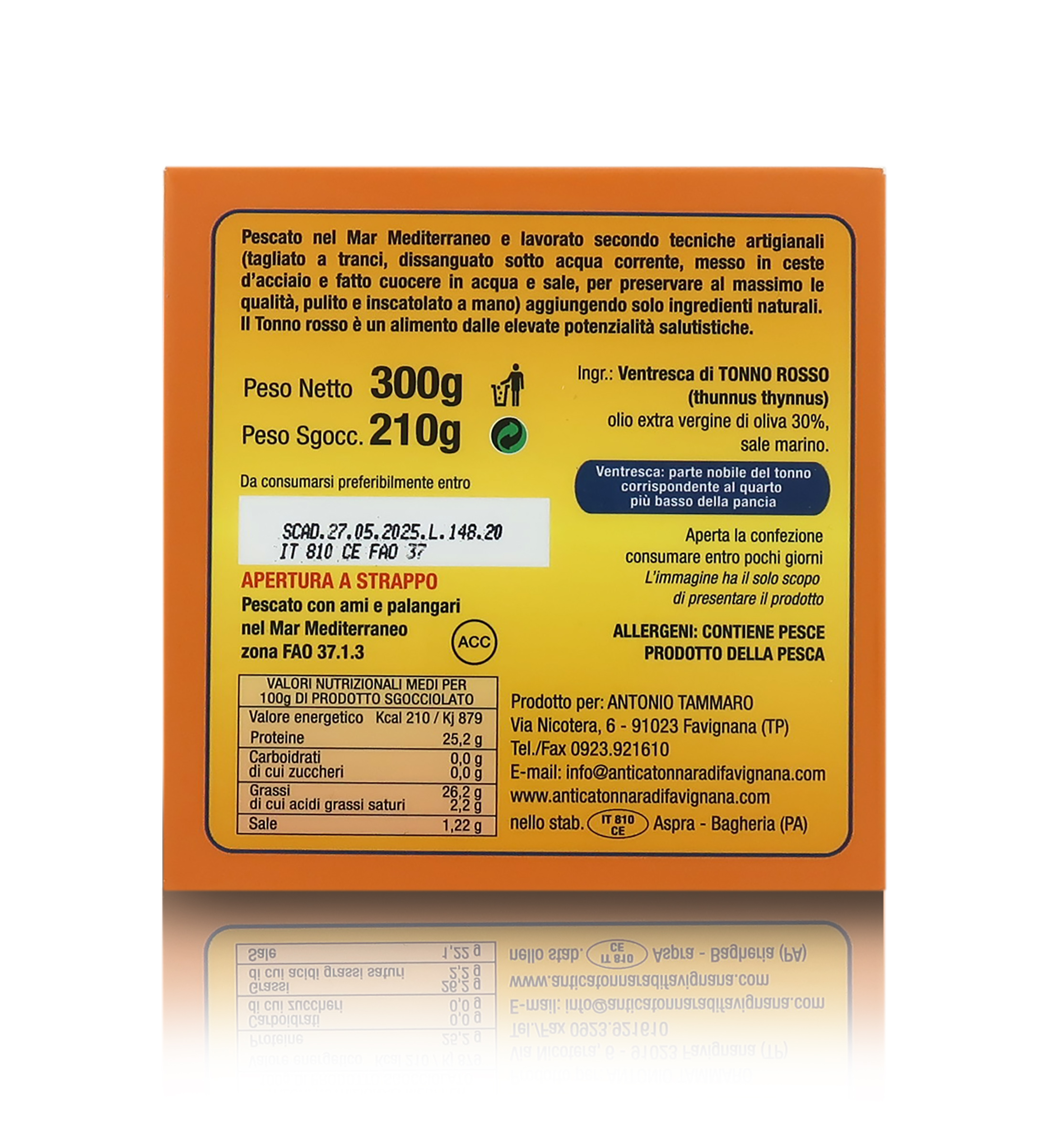 Ingredienti: ventresca di TONNO, olio extravergine d'oliva, sale marino. Conservazione: riporre in frigo dopo l’apertura e consumare entro 1/3 giorni.