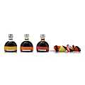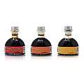 Confezione regalo Bauletto. Tris di bottiglie da 100 ml l'una, ognuna caratterizzata da una etichetta diversa che esprime differenti tempi d'invecchiamento e, di conseguenza, vari livelli di prestigio e diversi impieghi in cucina.