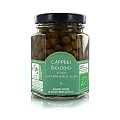 Capperi biologici in olio extravergine d’oliva, ottenuti esclusivamente da agricoltura biologica italiana. In vasetto. Peso netto: 100g (peso sgocciolato: 55g).