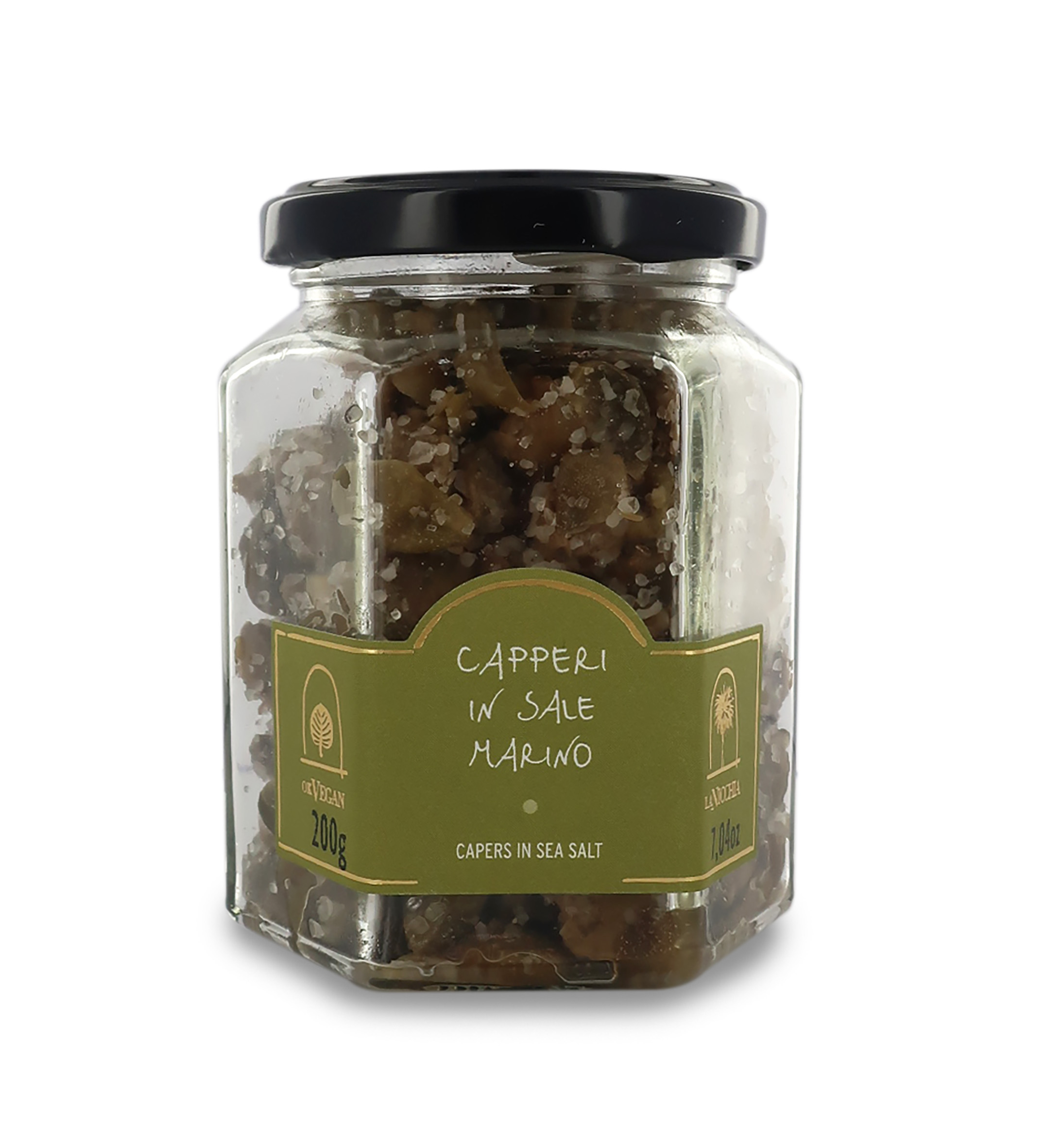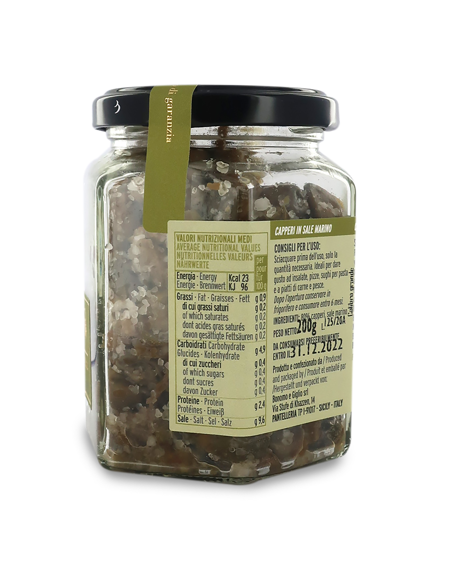 Capperi selezionati, calibro grande, conservati in sale marino. I capperi grandi sono indicati per condire sughi di pomodoro o per realizzare creme e patè. Sciacquarli dal sale prima dell’uso.
