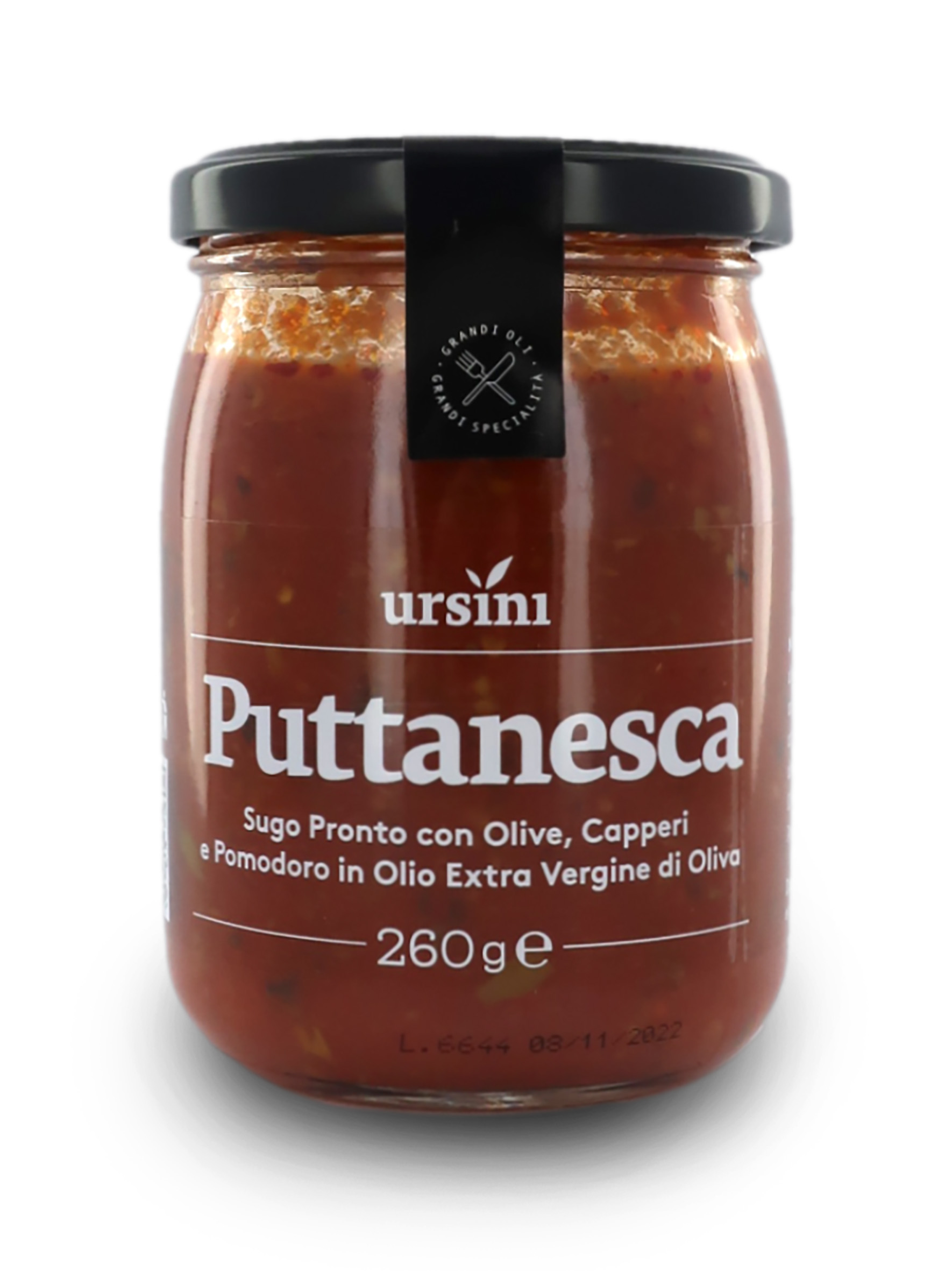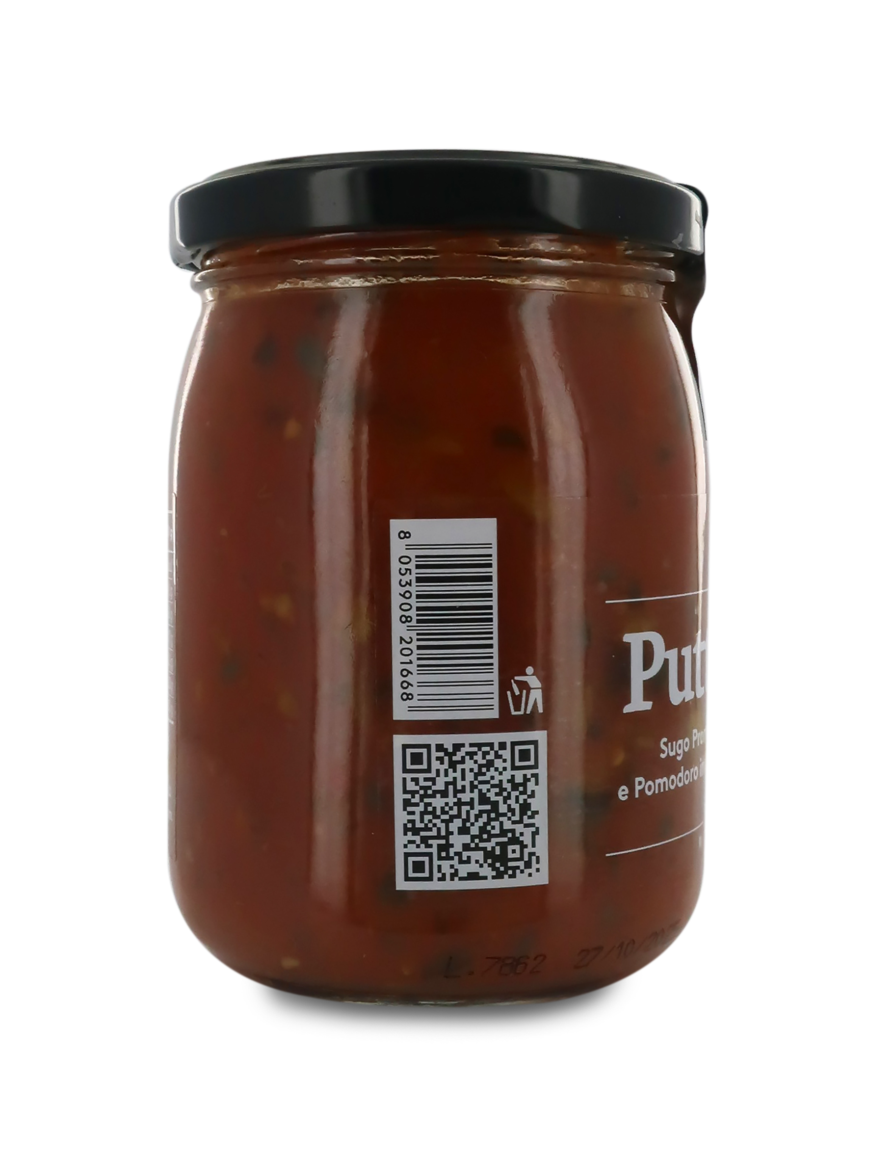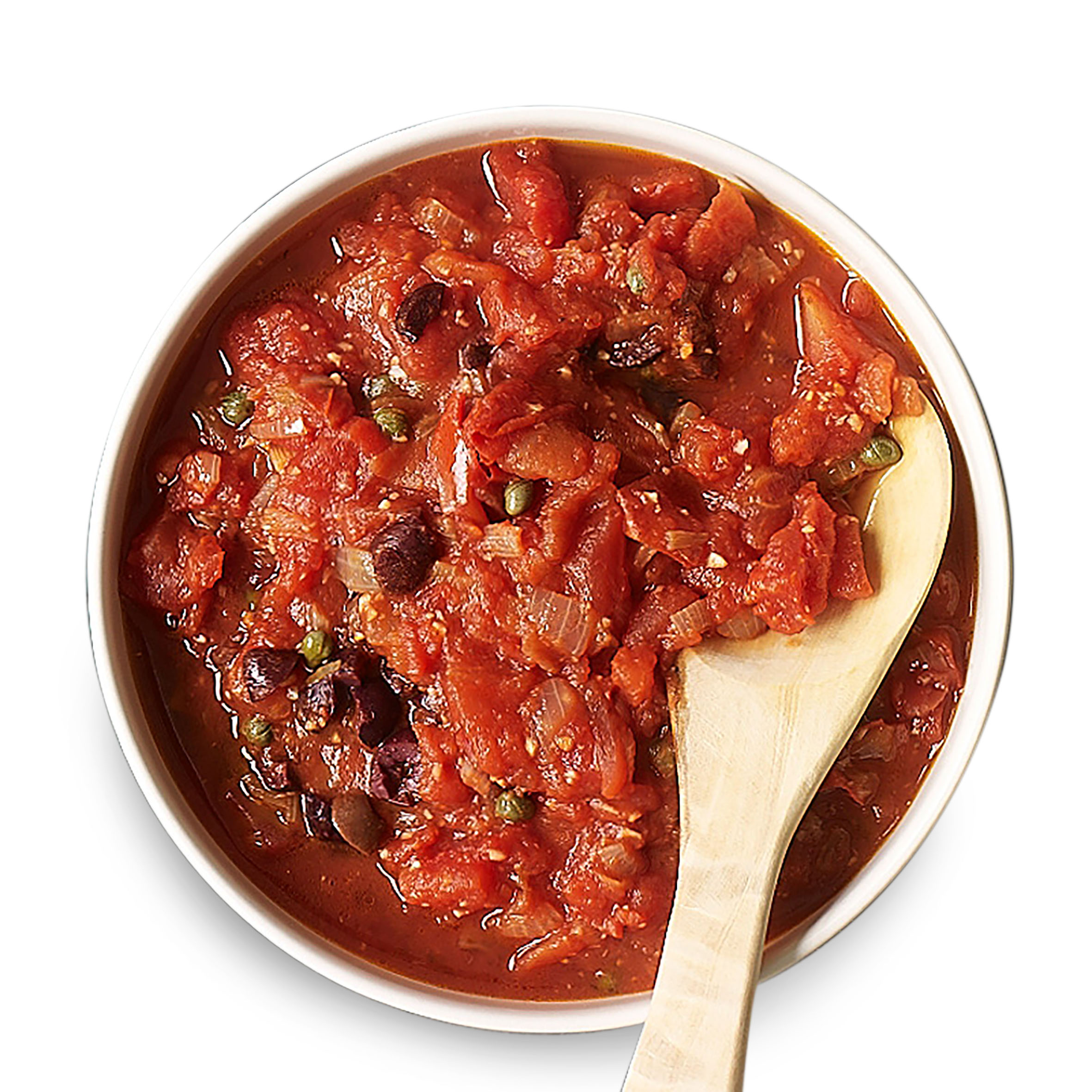 Sugo pronto a base di pomodoro con olive, capperi e olio extra vergine di oliva.