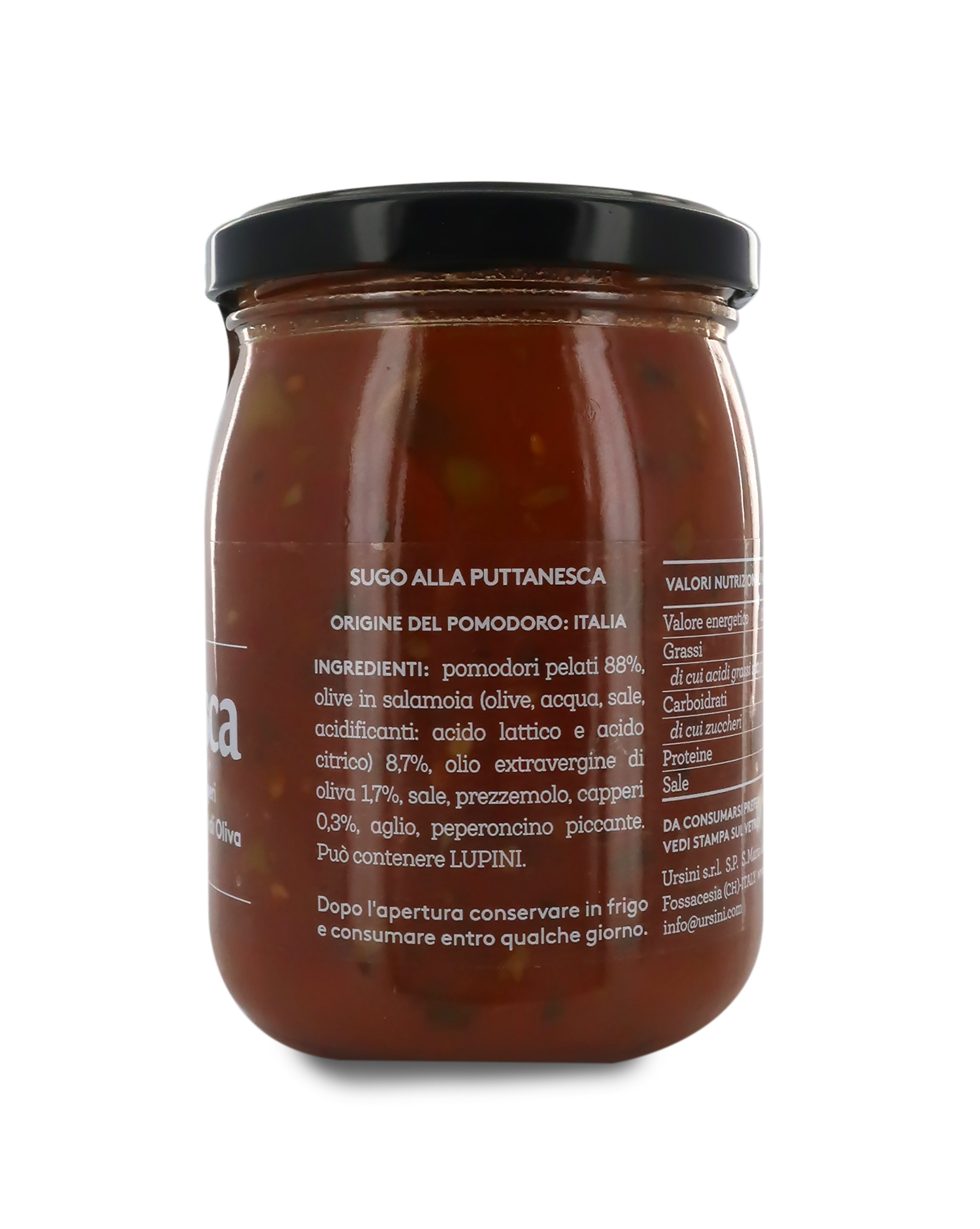 Ingredienti: pomodori pelati 88%, olive in salamoia (olive, acqua, sale, acidificanti: acido lattico e acido citrico) 8,7%, olio extravergine di oliva 1,7%, sale, prezzemolo, capperi 0,3%, aglio, peperoncino piccante. Può contenere LUPINI.