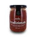 Sugo tradizionale al pomodoro, pronto da scaldare (2/3 min.) e da consumare. Contiene pomodoro pelato, olio extravergine di oliva e cipolla. La semplicità e la genuinità del gusto del pomodoro rende questo condimento uno dei più amati sughi della tradizione culinaria italiana.