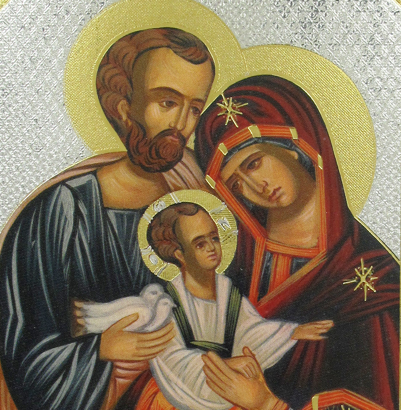 Biglietto natalizio con icona S.Famiglia e decori oro e argento