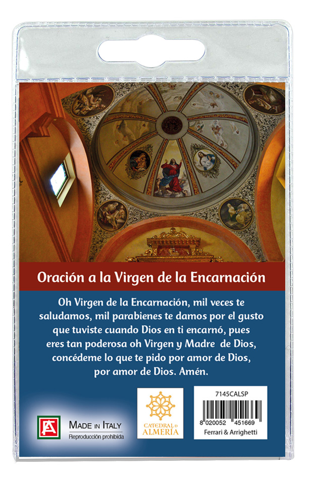 Calamita in metallo nichelato raffigurante la Catedral de Almeria con una preghiera in spagnolo.