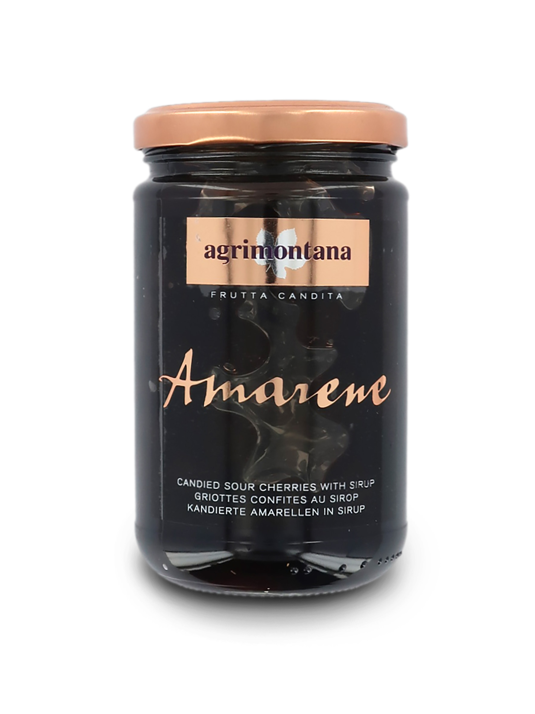 Amarene intere denocciolate, calibrate e selezionate a mano dopo la canditura, che avviene mediante immersione in gustoso sciroppo. Le amarene sono candite in piccole vasche. La loro dolcezza naturale e la loro morbida consistenza è preservata dallo sciroppo di canditura. Calibro: 18/20. Ottime da usare per cocktail, coppe di gelato con amici, in pasticceria per lievitati, torte e guarnizioni. È utilizzabile anche lo sciroppo di conservazione.