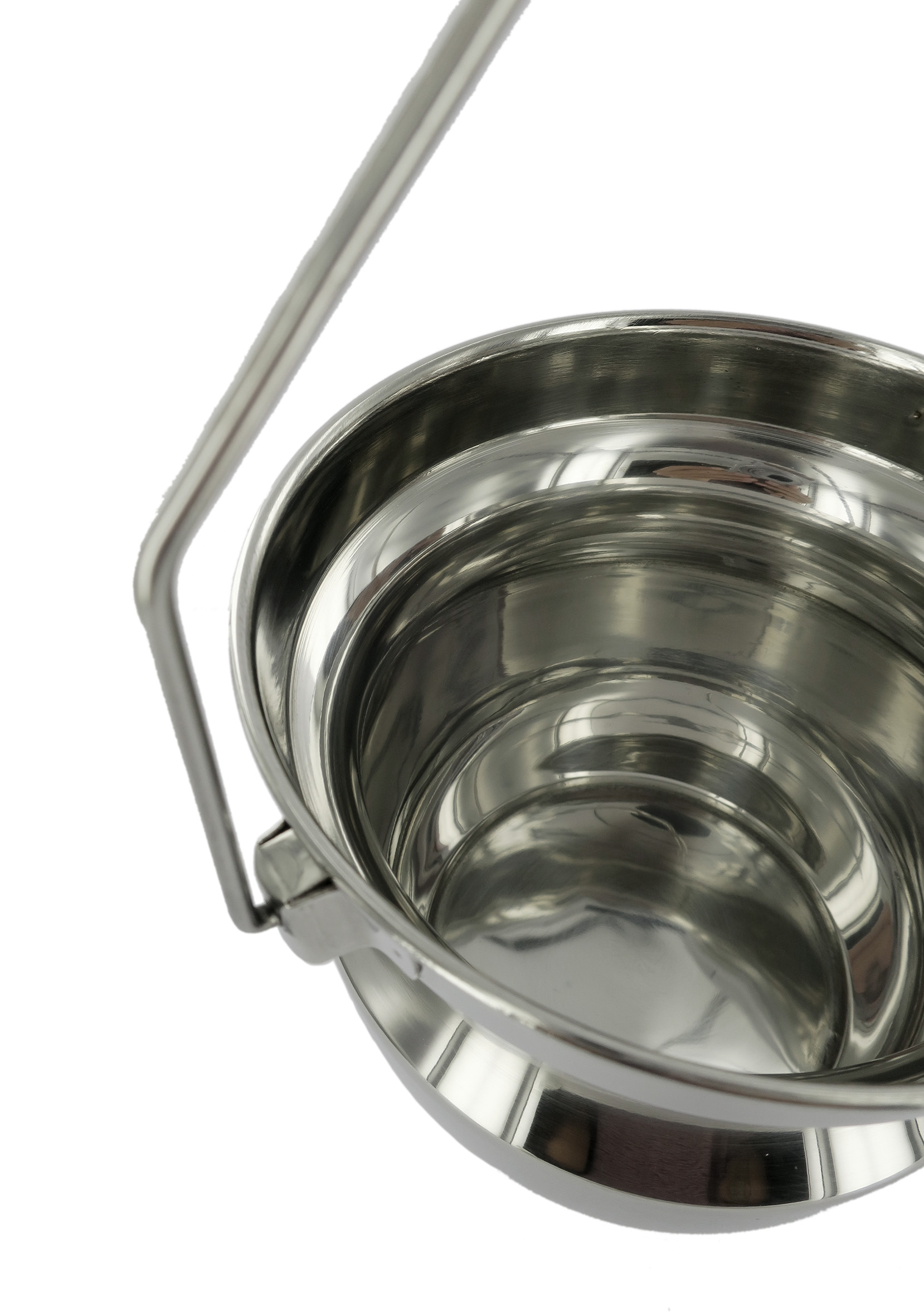 Secchiello per benedizioni senza fodera, realizzato in acciaio inossidabile. Dimensioni: altezza 11,5 cm e diametro 13,5 cm. Realizzato in Italia.
