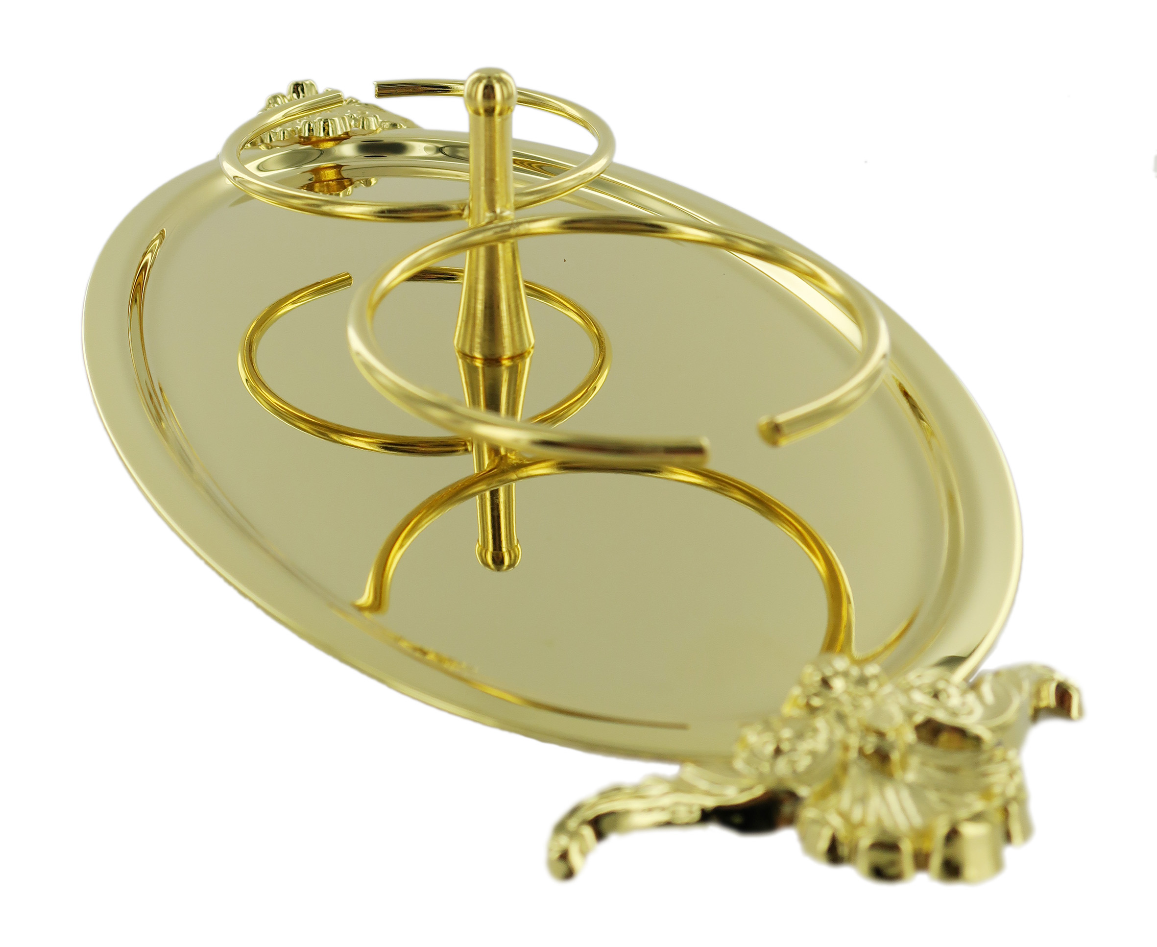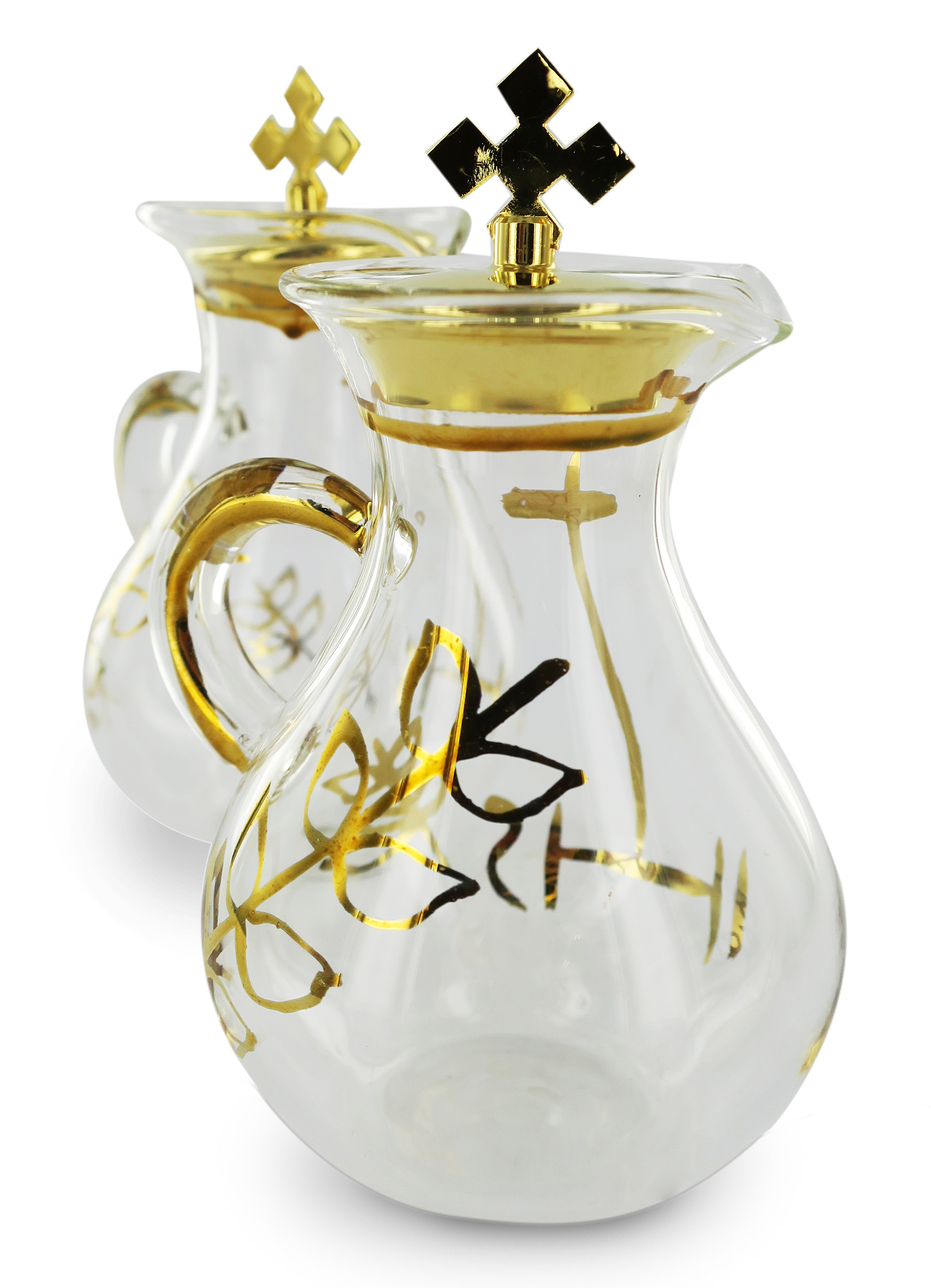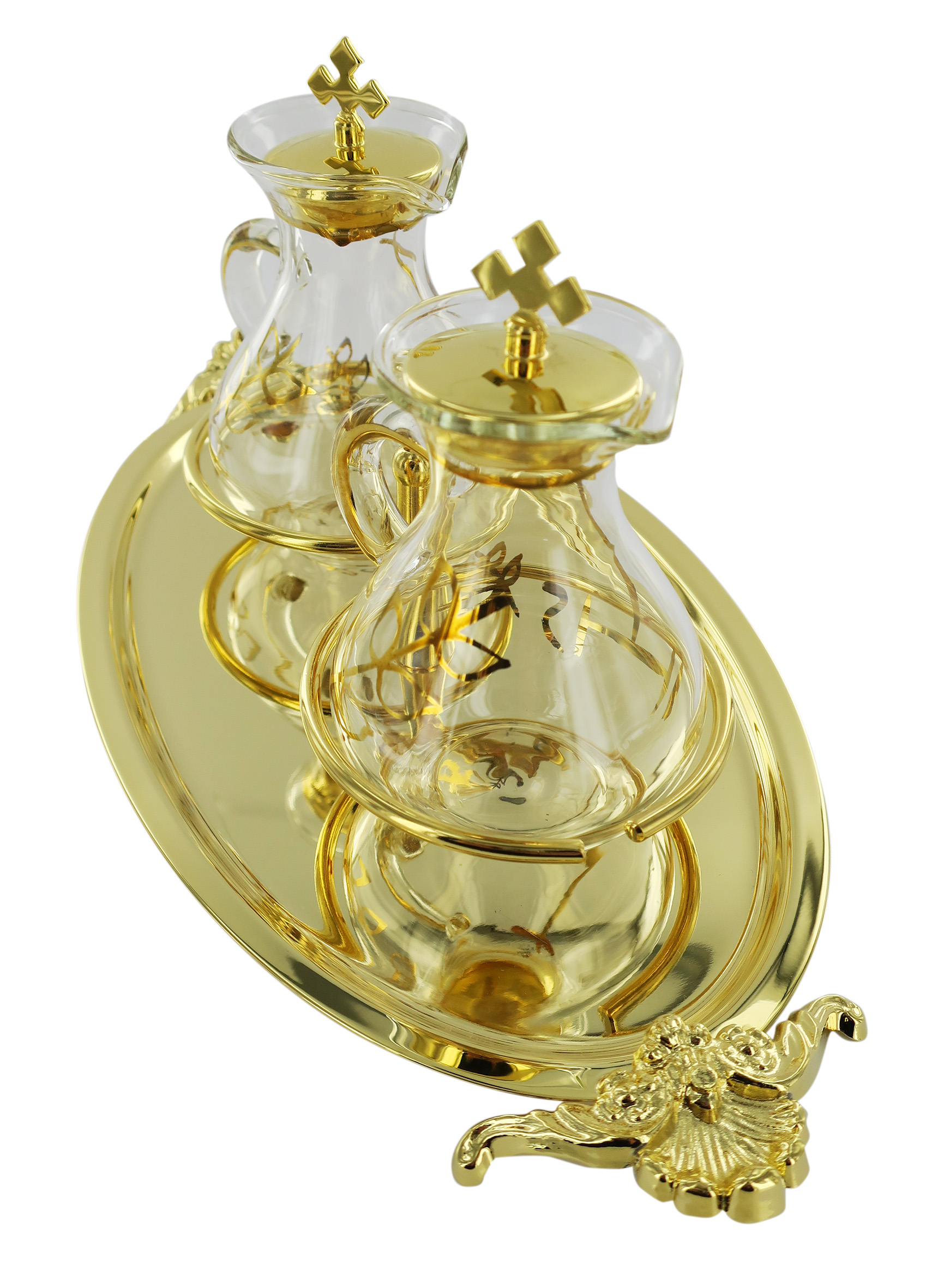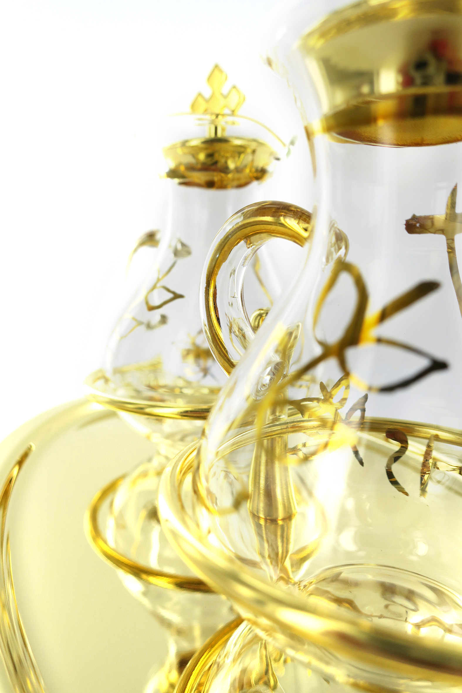 Coppia di ampolline in vetro soffiato con decori dorati e vassoio in ottone dorato con manici che fungono da piedini di appoggio.