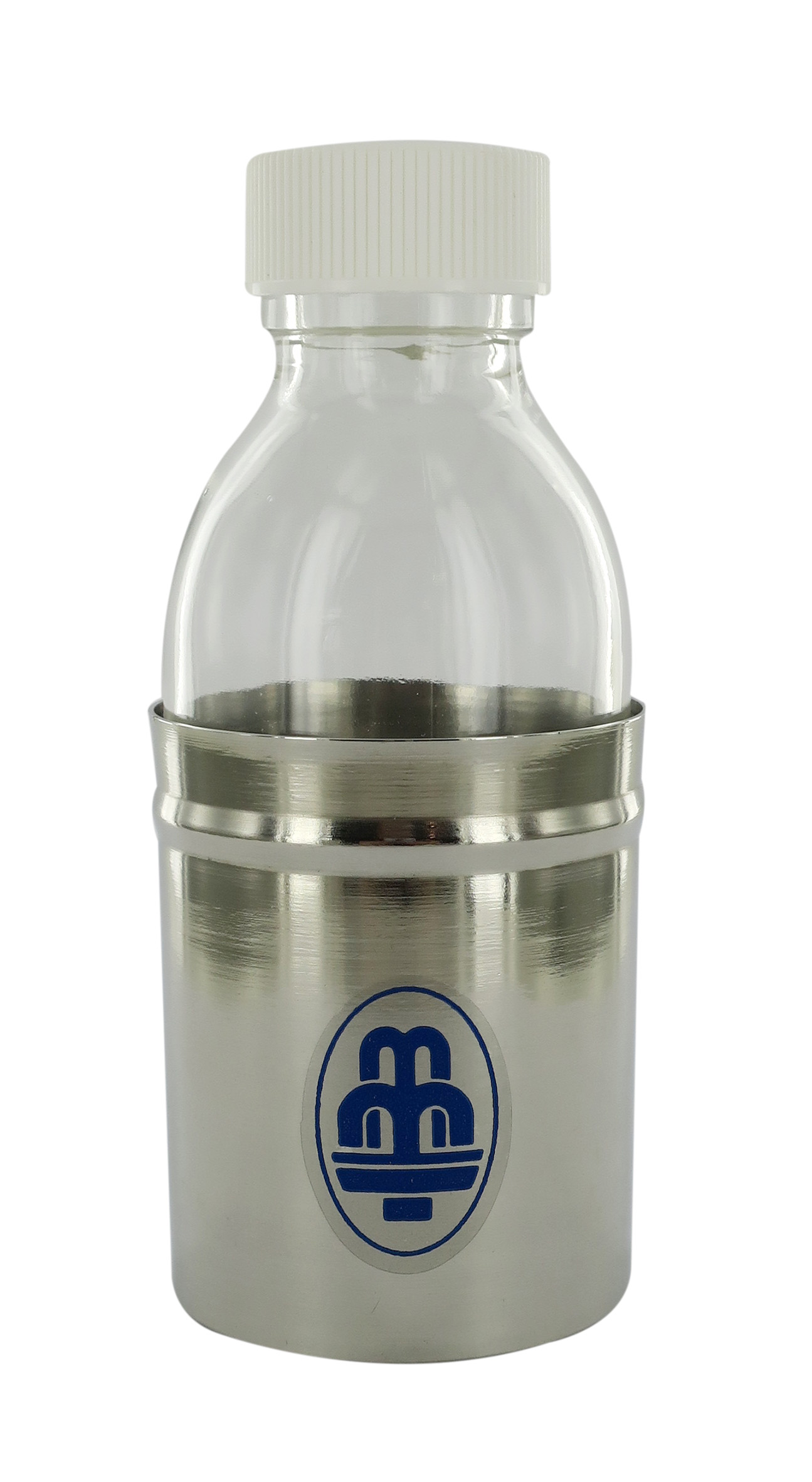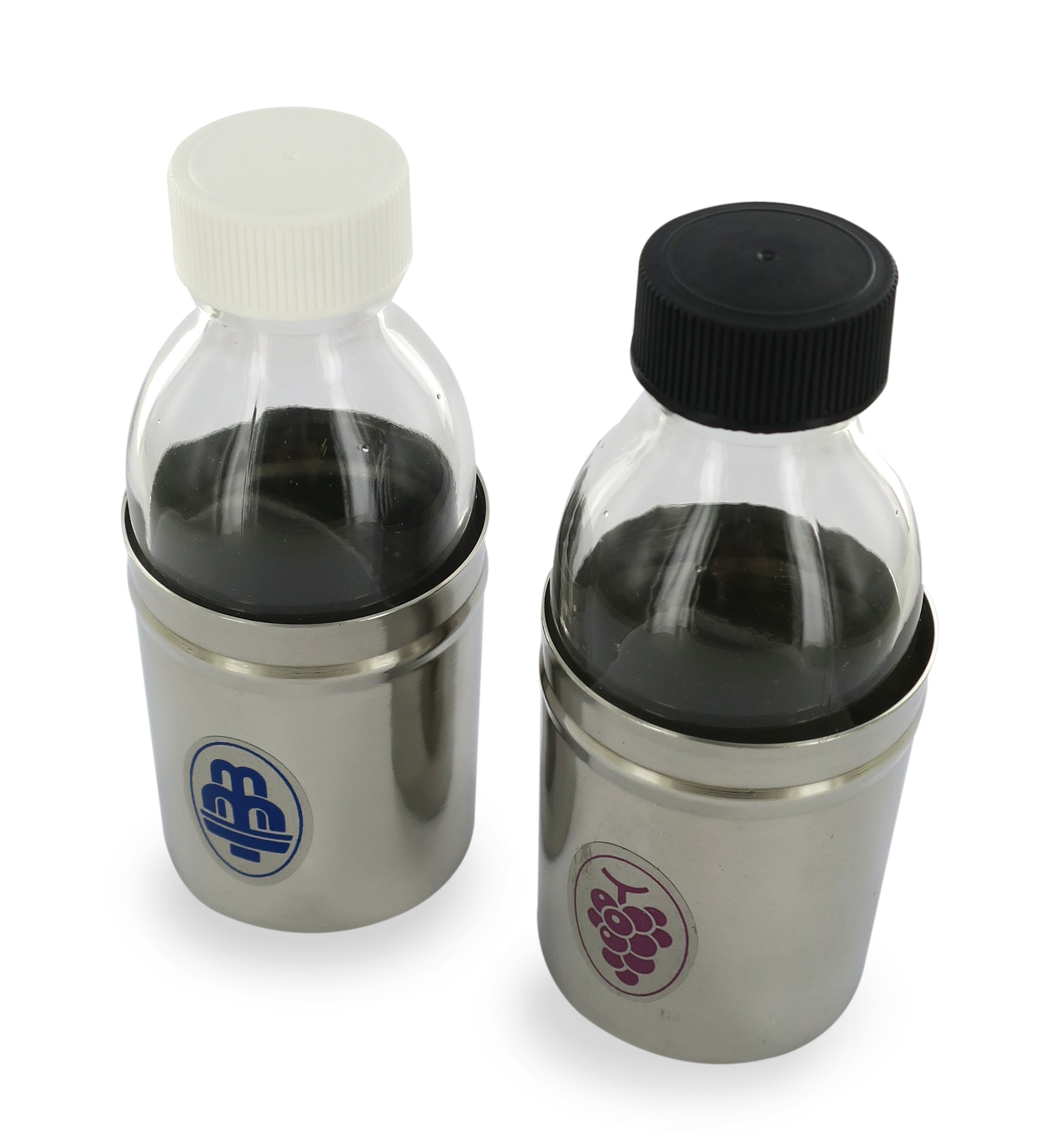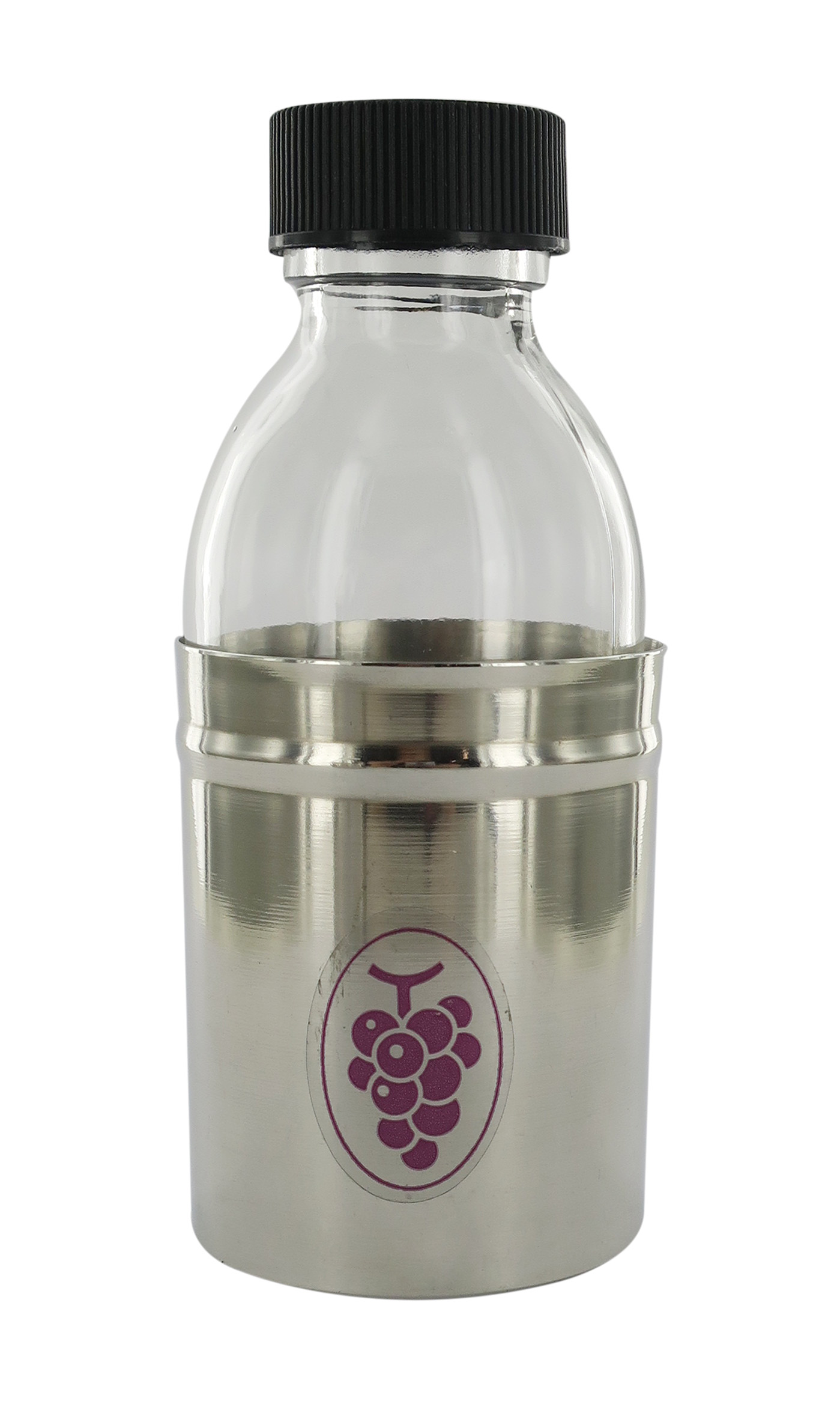 Coppia bottiglie acqua e vino con corazza da 125 cc. Altezza pari a 12 cm, diametro 5,5 cm. Realizzato in Italia.