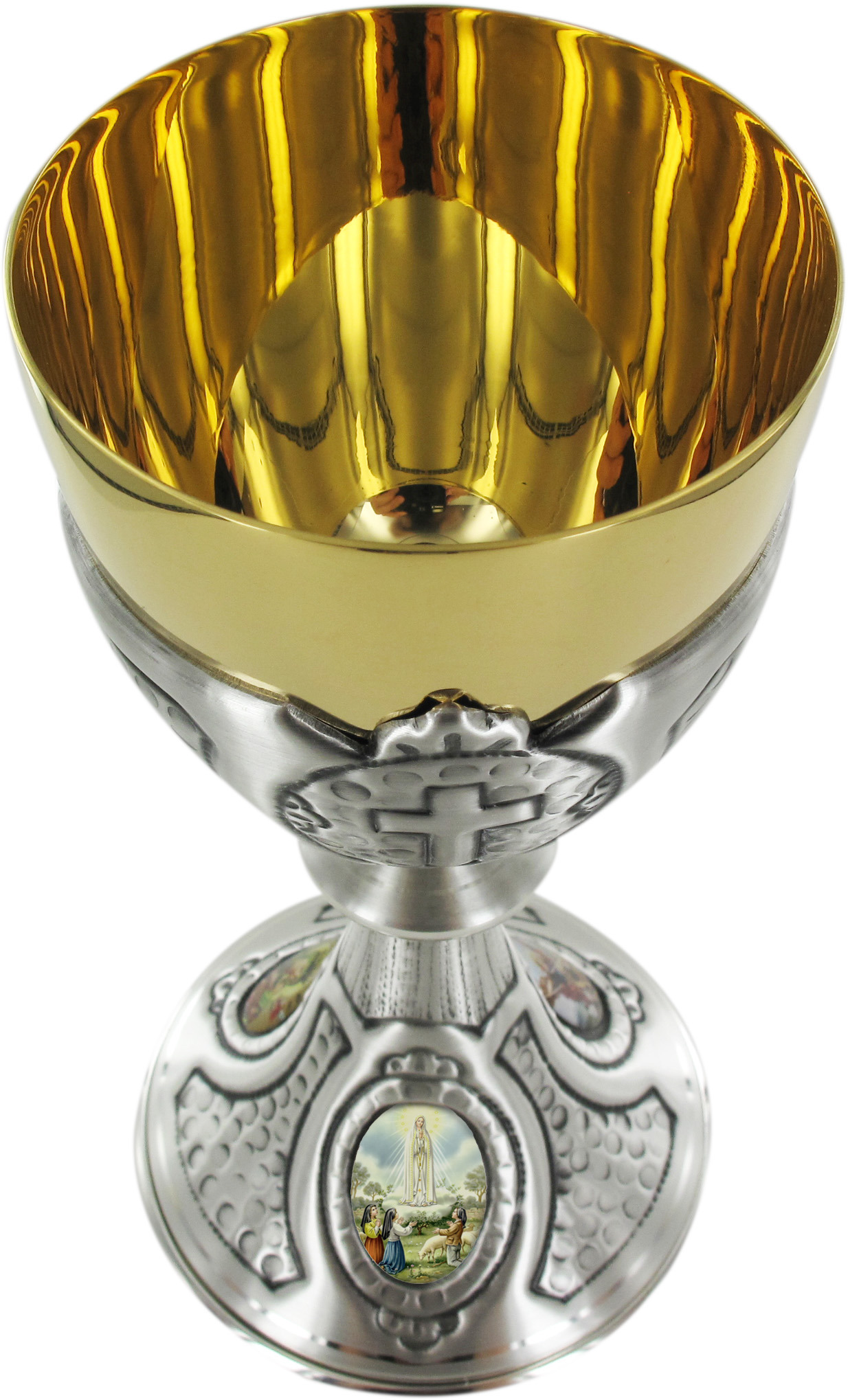 Calice in metallo argentato con immagini di S.Antonio, Fatima e Miracolosa - 21 cm