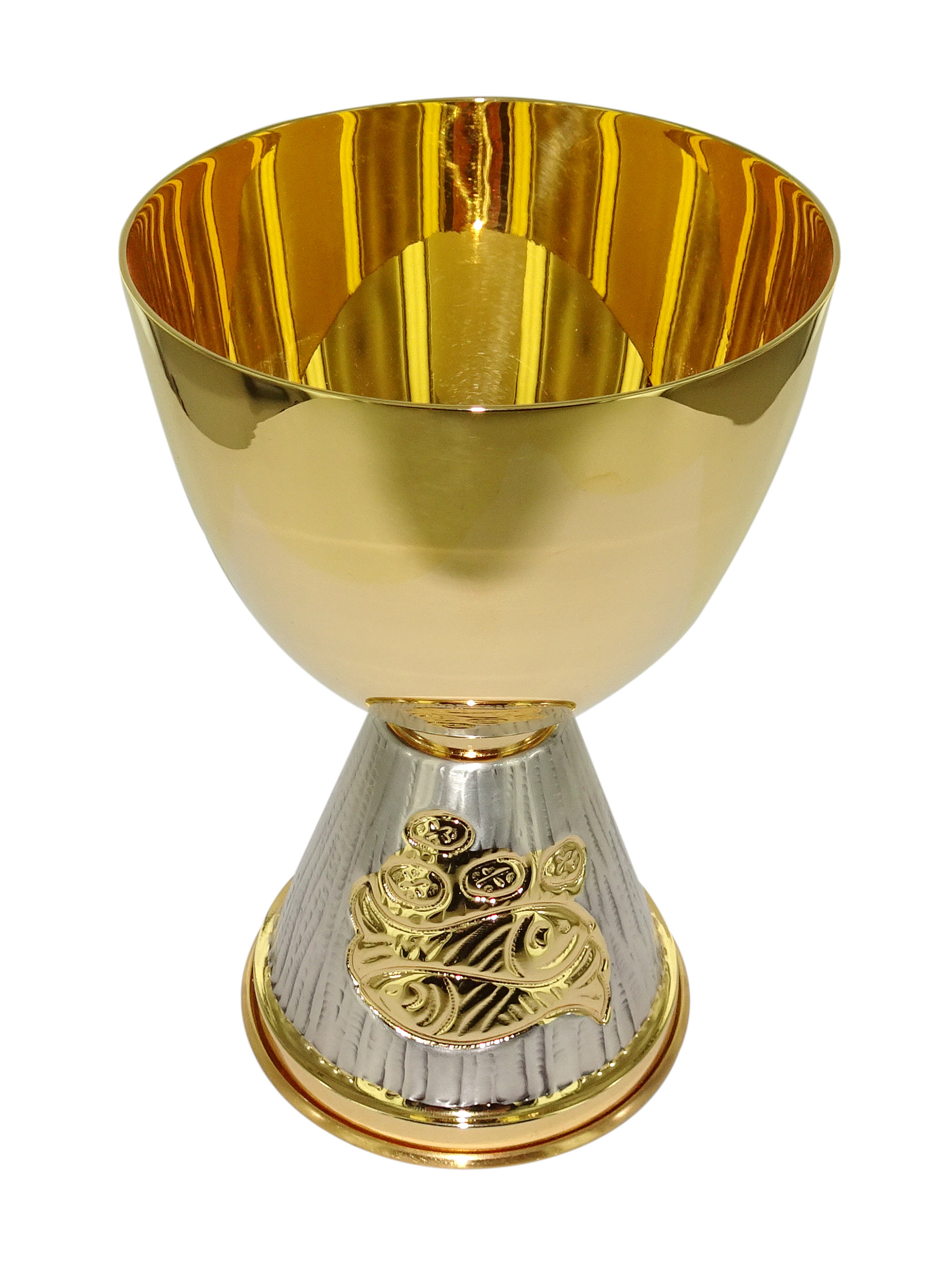Calice in ottone dorato con base argentata e su di essa vi sono sbalzati a mano due pesci e il pane, simboli della cena, con finitura dorata. Il calice è alto cm.16. L'altezza della coppa è di cm.8 e il diametro della coppa stessa è di cm 9.5 mentre la base ha un diamtero di cm.8 ed un altezza di cm.8.