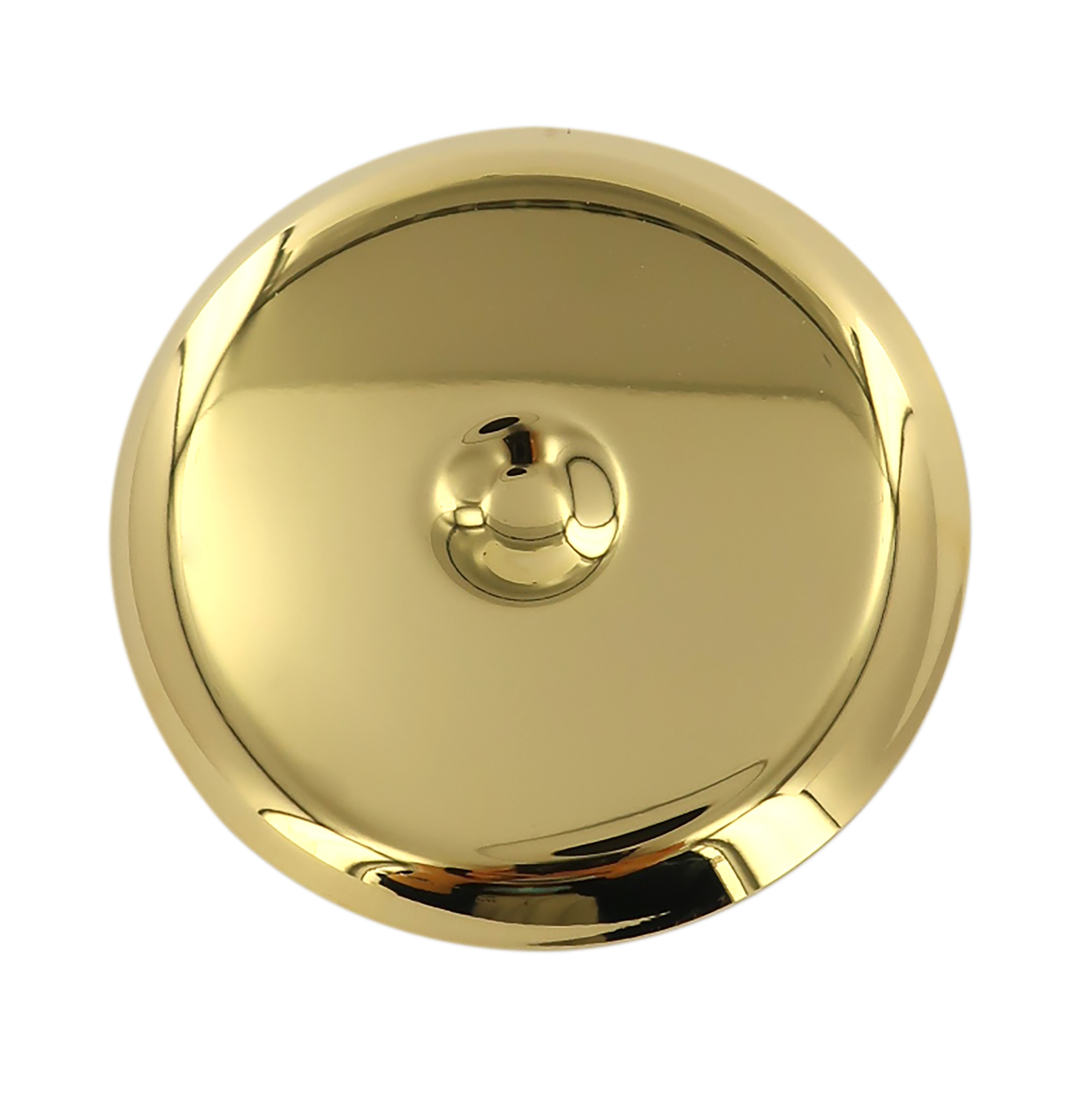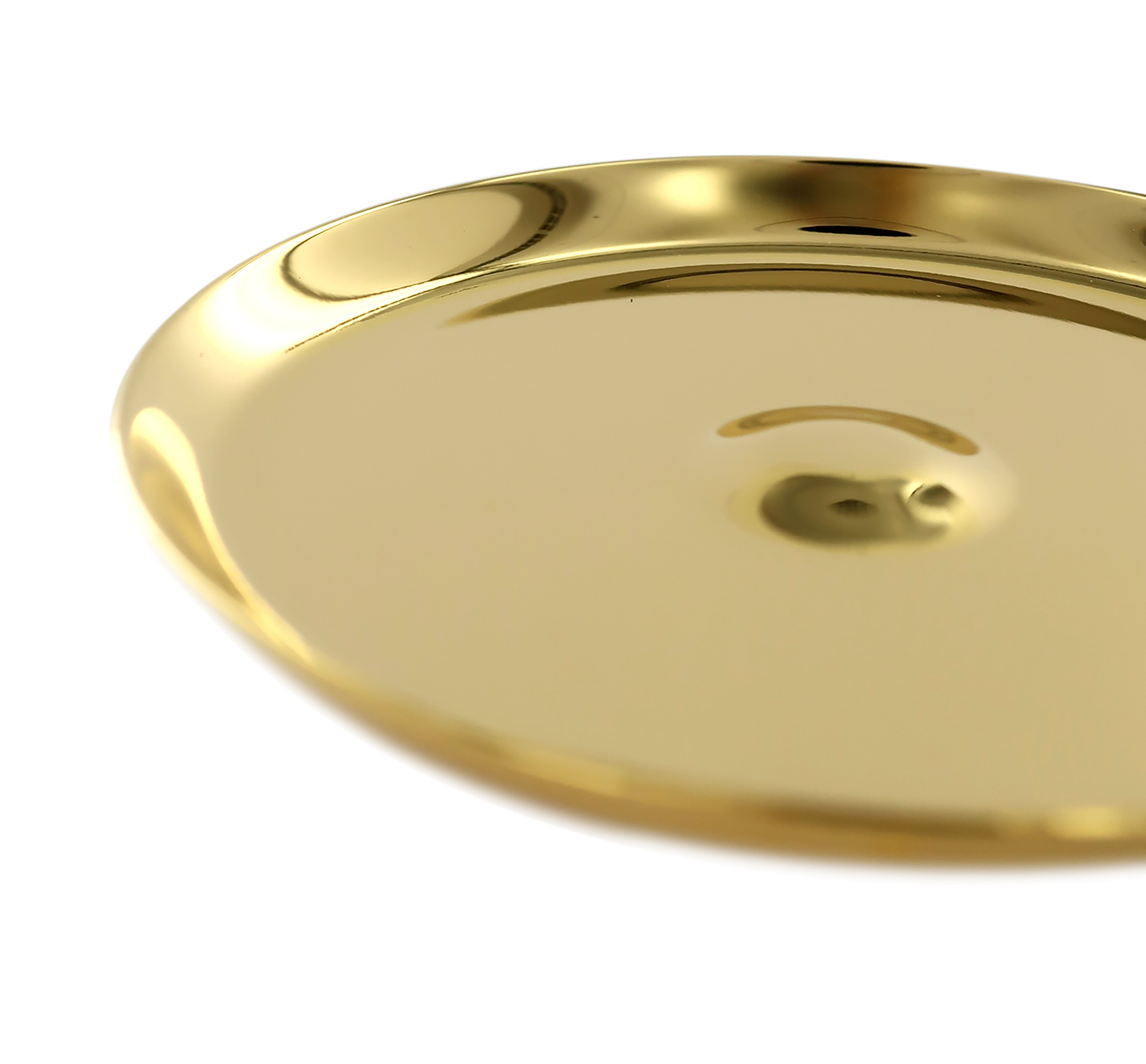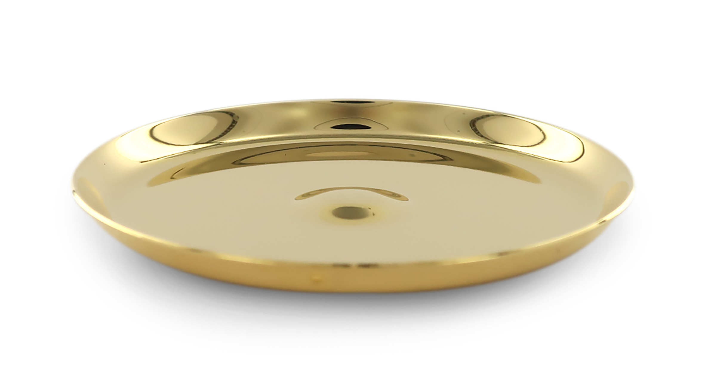 Patena in metallo dorato, diametro 7 cm. Realizzata in Italia.