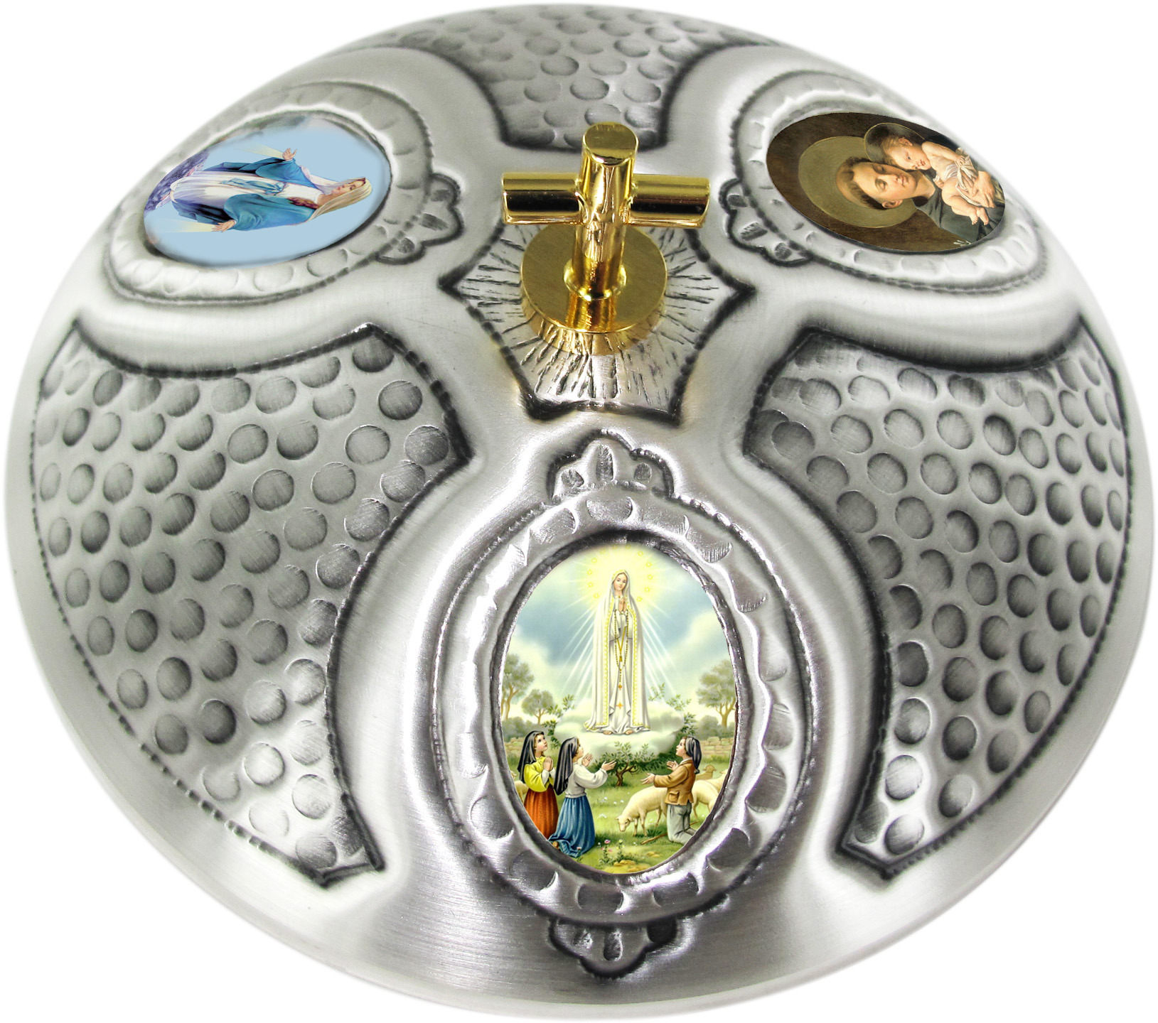 Pisside in metallo argentato con immagini di Sant'Antonio Fatima e Miracolosa - 12x12 cm