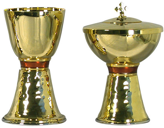 Pisside in metallo dorato con anello smaltato. Dimensioni: diametro 11,5 cm, altezza pari a 16 cm. Contiene circa 150 particole. Realizzato in Italia.