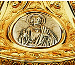 Pisside in ottone dorato esternamente e internamente da cm. 22,5 x 12,5. Capienza della pisside circa 270 particole. Sono presenti ornamenti ricchi di stile gotico, con medaglioni raffiguranti il Sacro Cuore, San Giuseppe con il Bambino Gesù, e Maria.