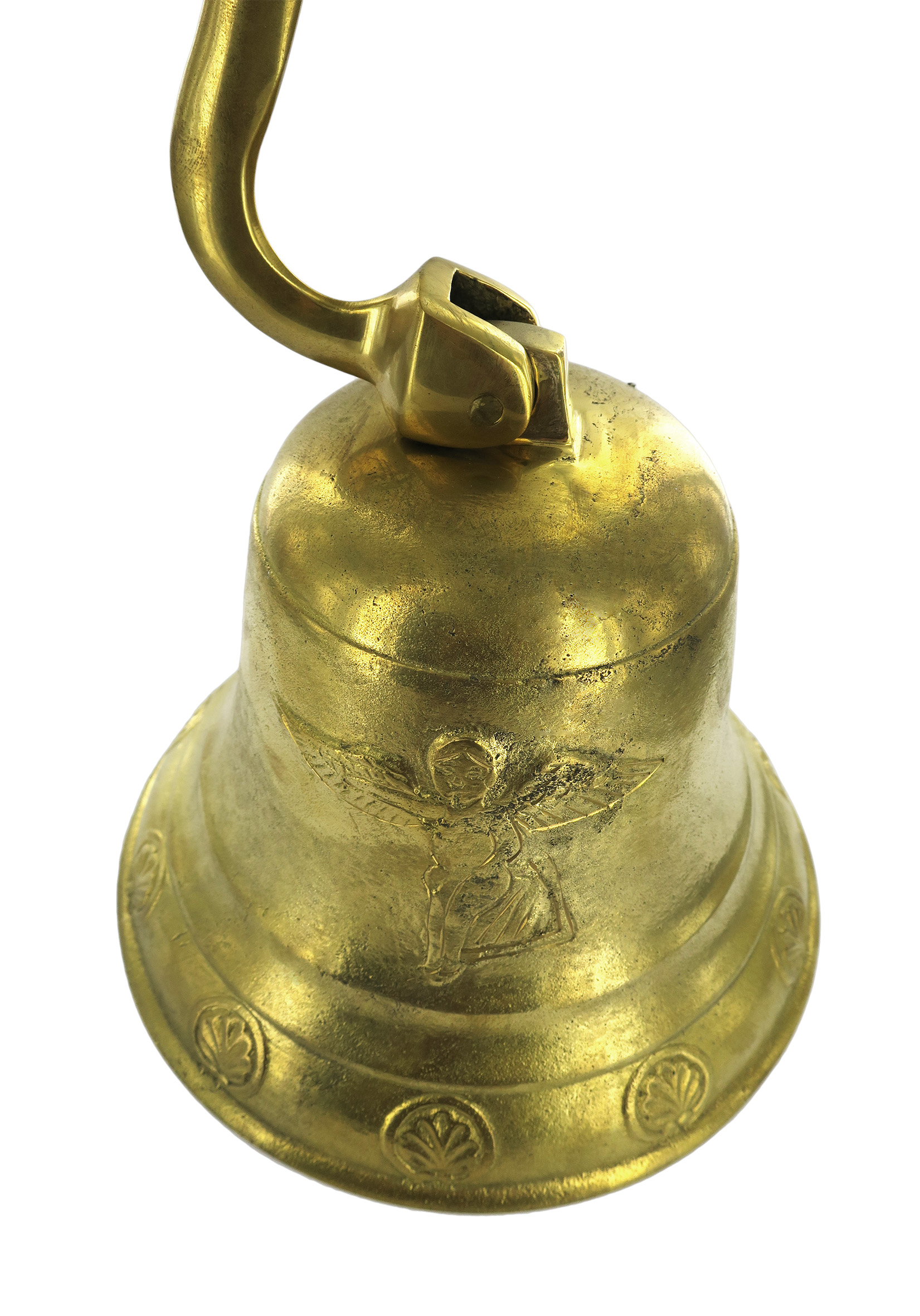 Campana in ottone dorato con angeli, con attacco a muro da 20 cm. Realizzata in Italia.