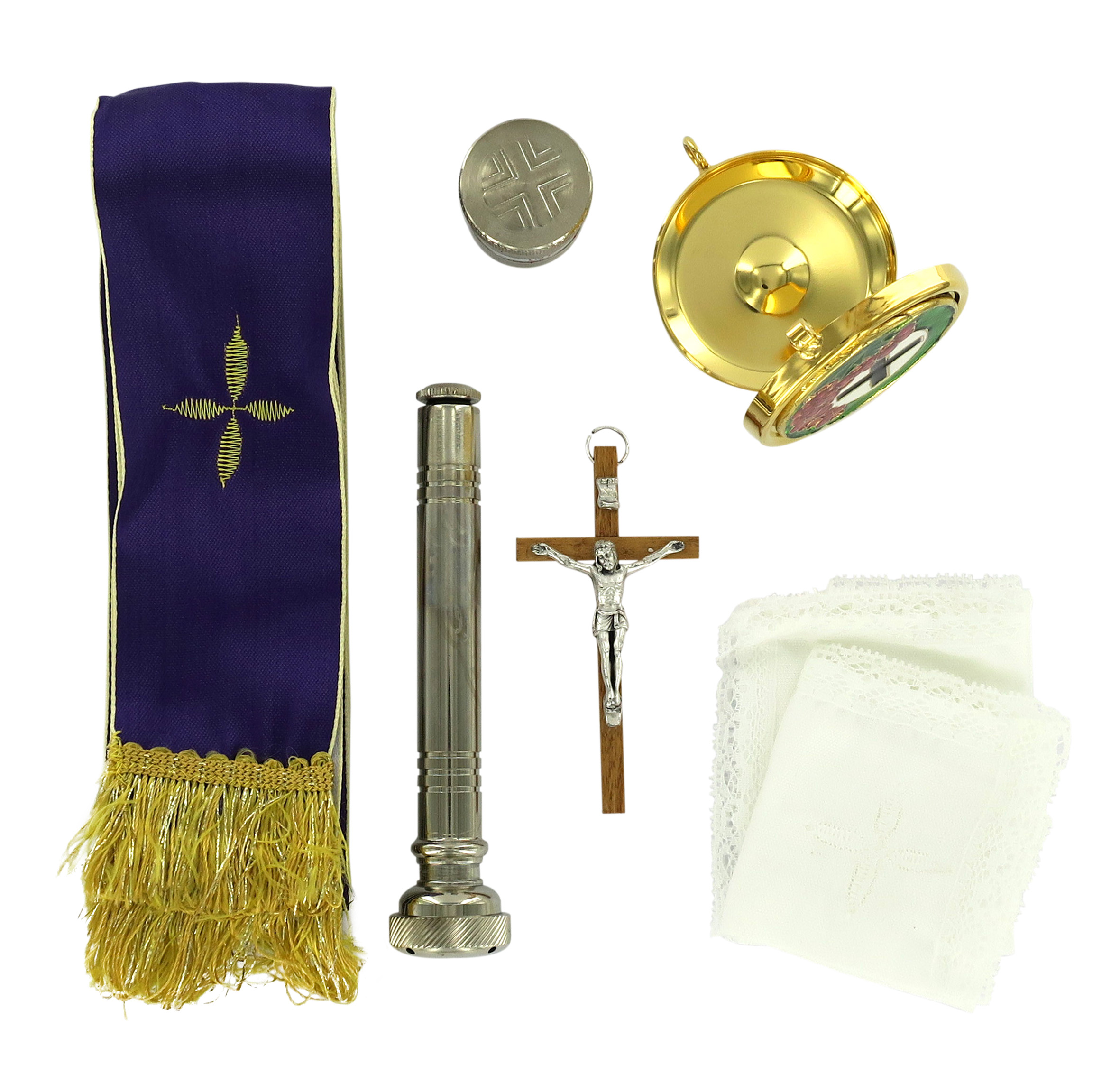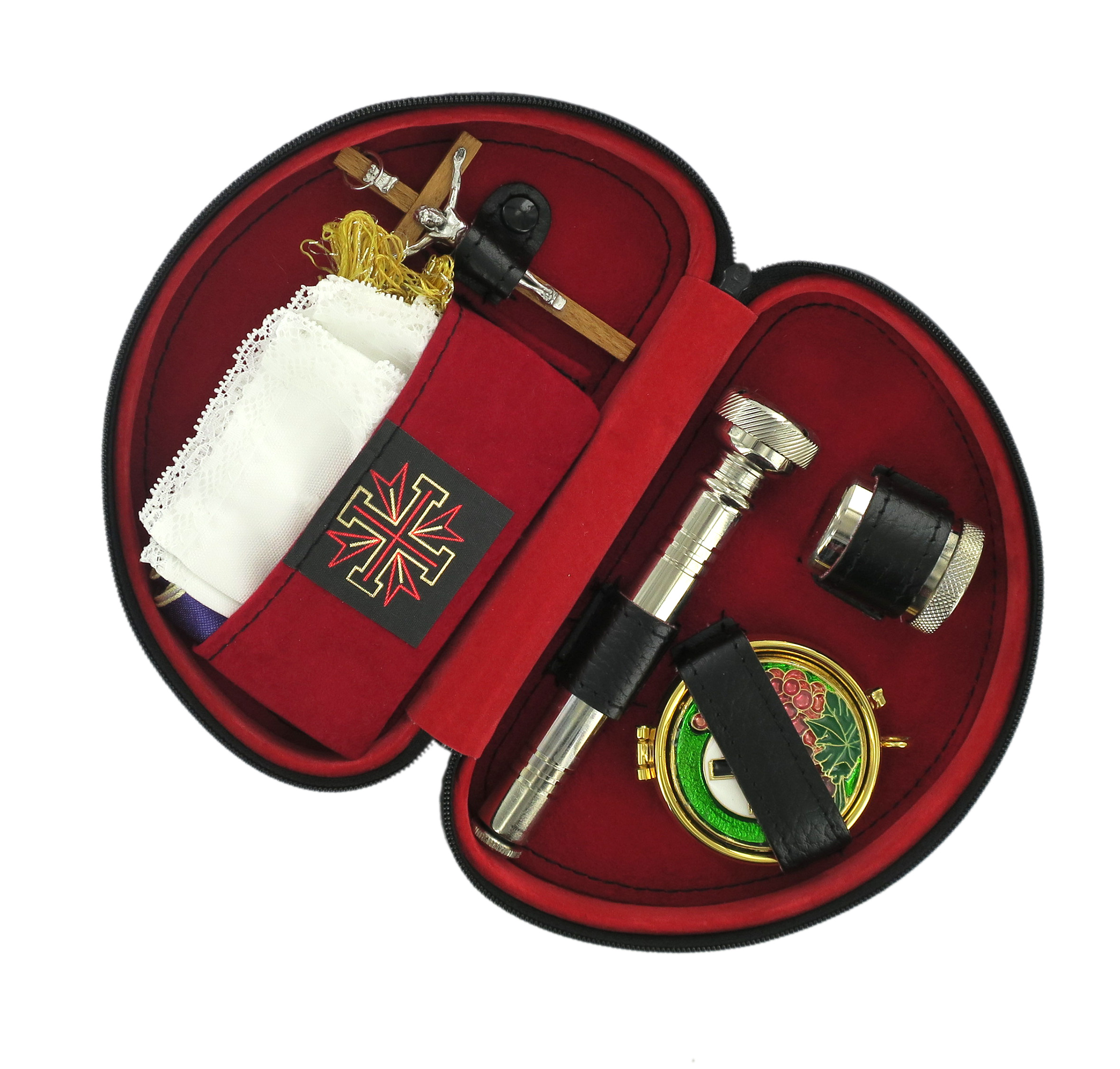 Astuccio ( kit celebrazione messa) morbido in similpelle con zip 16,5x11x5,5 cm. Contiene: croce, teca, vasetto, asperges, purifichino, stola.