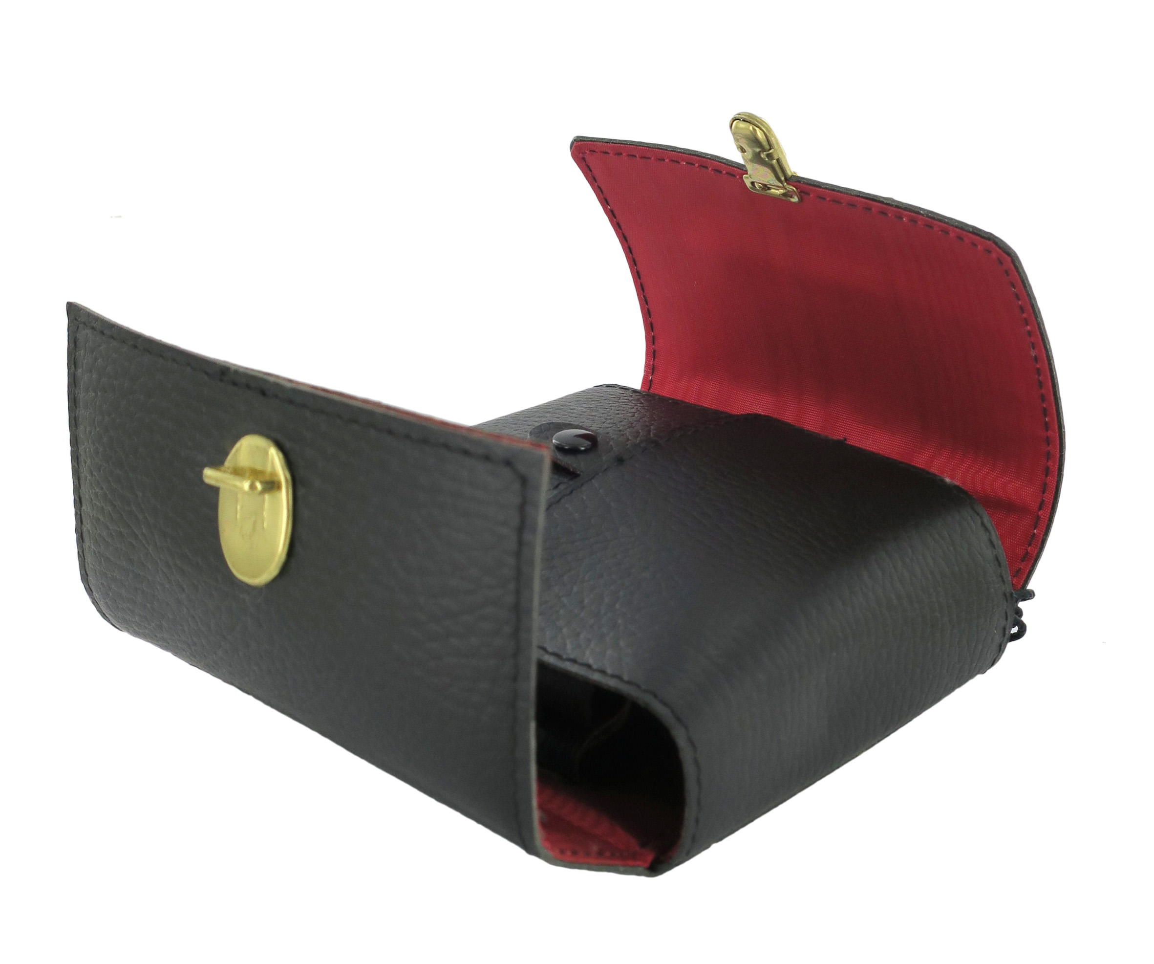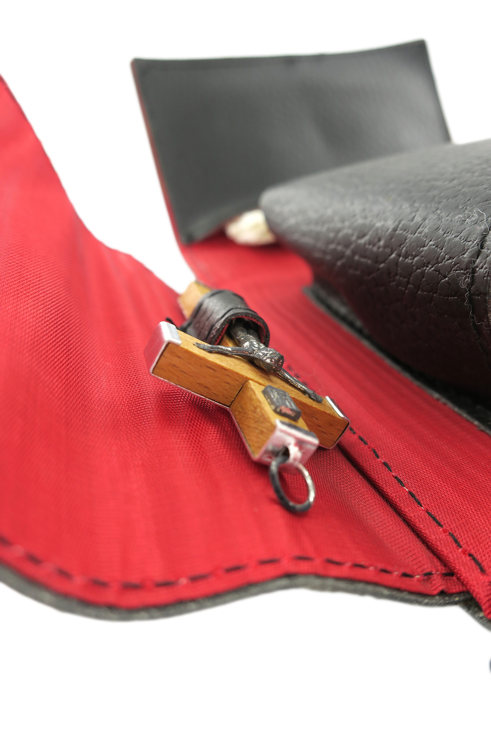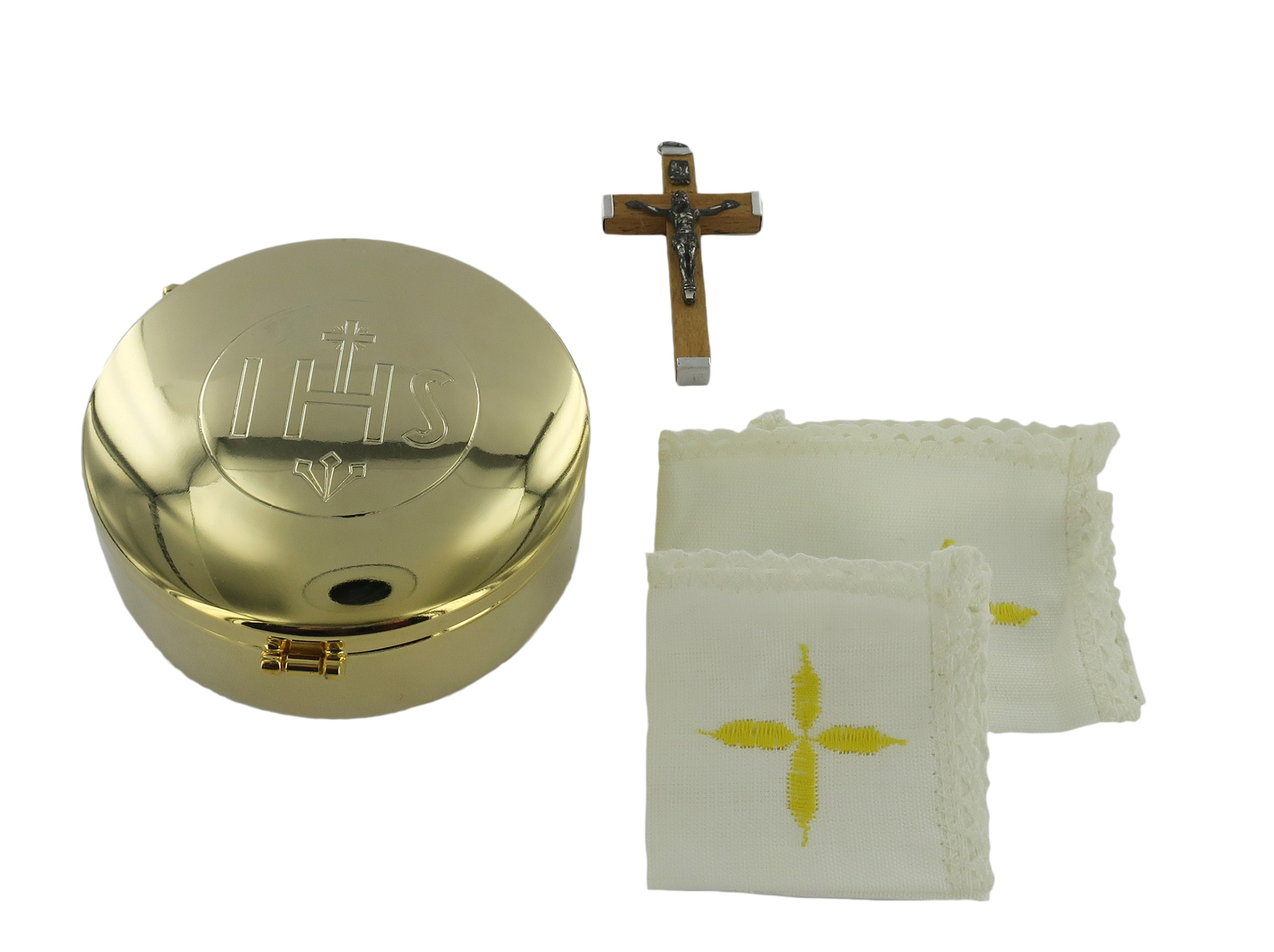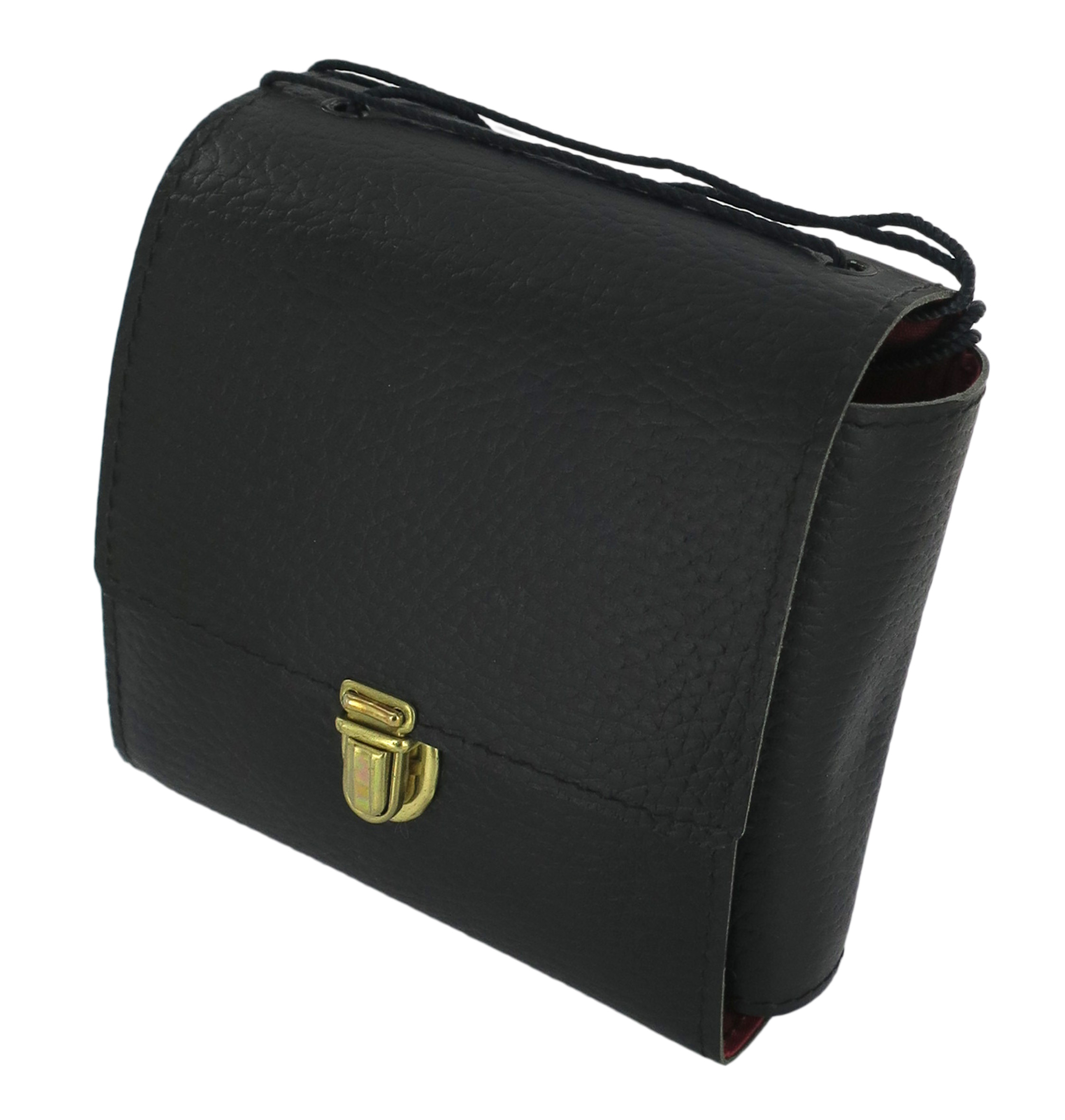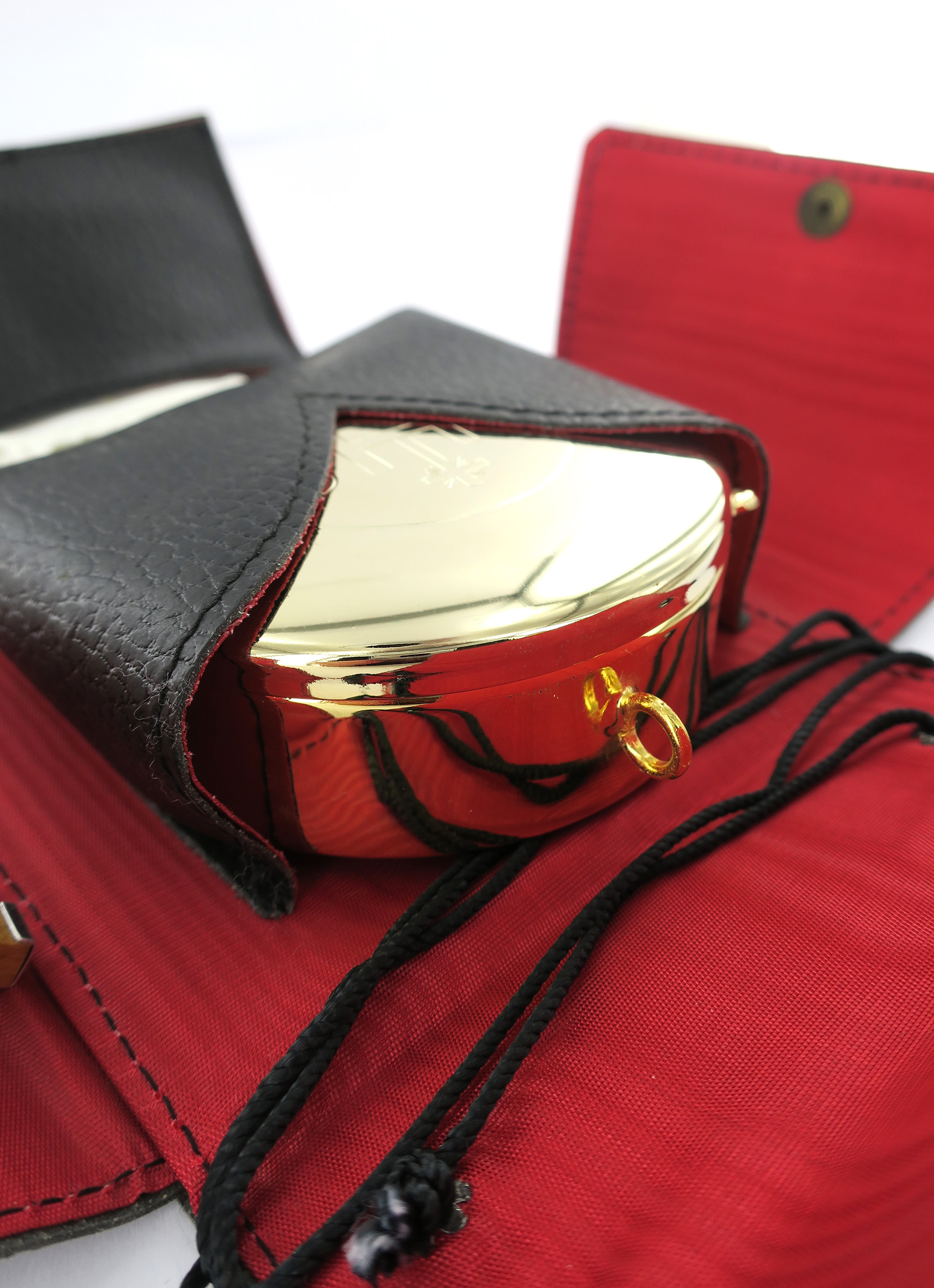 Astuccio ( kit celebrazione messa) teca grande 11x11x4 cm. In pelle nera, con teca dorata Ø 9 cm.