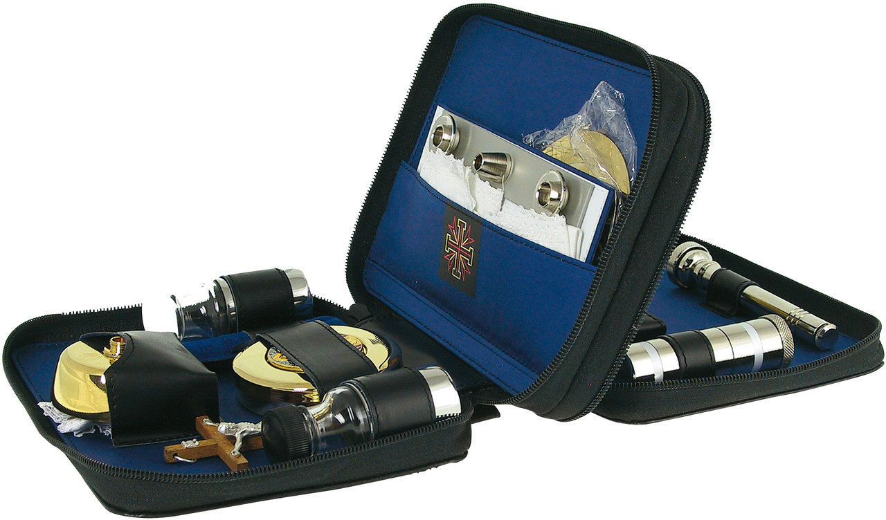 Completo a due scomparti in vera pelle 21x16x8 cm. Contiene tutto il necessario per la Celebrazione. Calice componibile, patena, scatola per Particole, altarino, candeline, crocefisso, bottiglie acqua e vino, tovagliolini e stola. Inoltre, in un altro scomparto, completo per battesimo, comunione e benedizione.