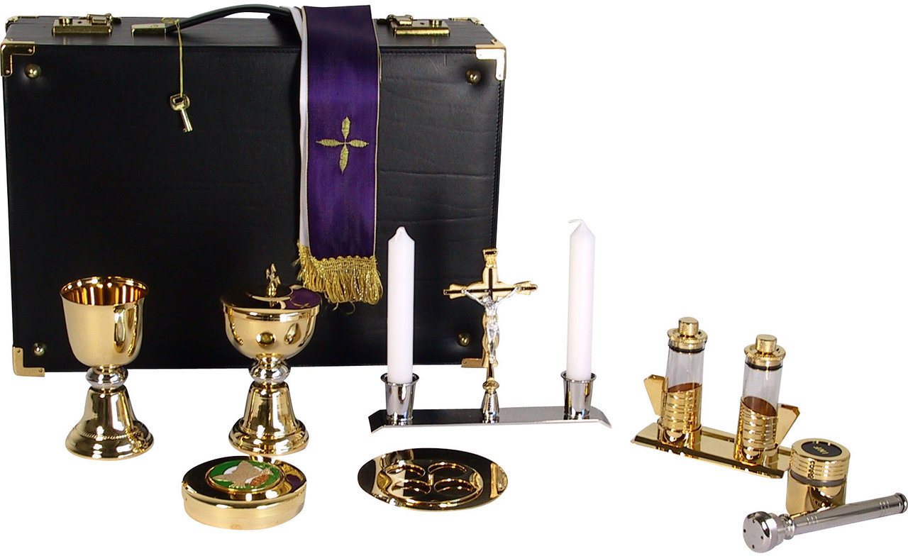 Valigia "Serena" con 16 oggetti 24x36x12 cm. In pelle, molto portabile e poco ingombrante, questa valigetta è completa per Celebrazione e ha tutto il necessario per i Viatici.