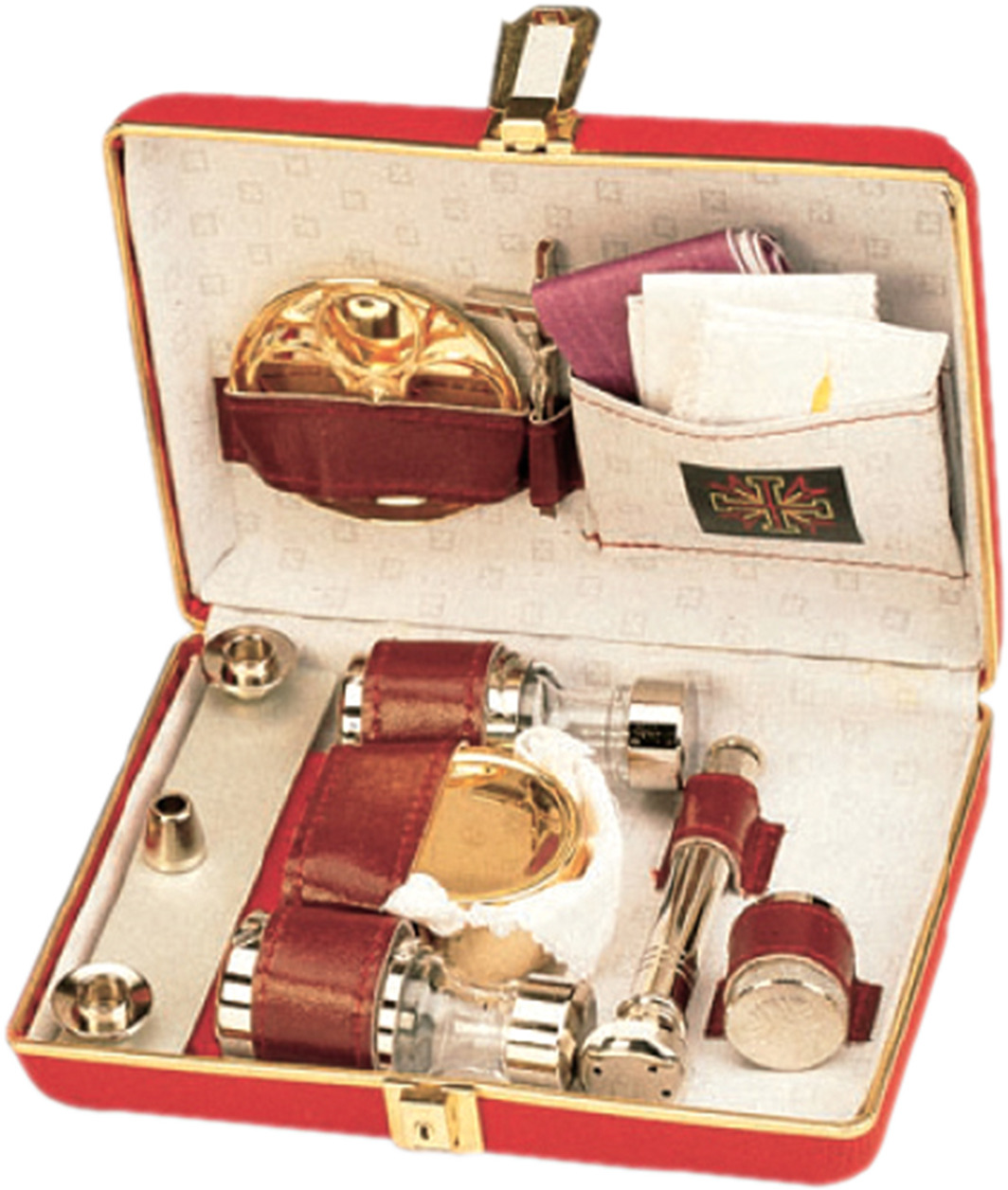 Valigia per celebrazioni: Servizio da messa completo con 16 oggetti. Dimensioni: 14 x 21 x 5 cm. In dimensioni ridottissime, una praticità incredibile in viaggio. Completo di Viatici, calice componibile di capacità eccellente, scatolina per particole e patena. Realizzato in Italia.