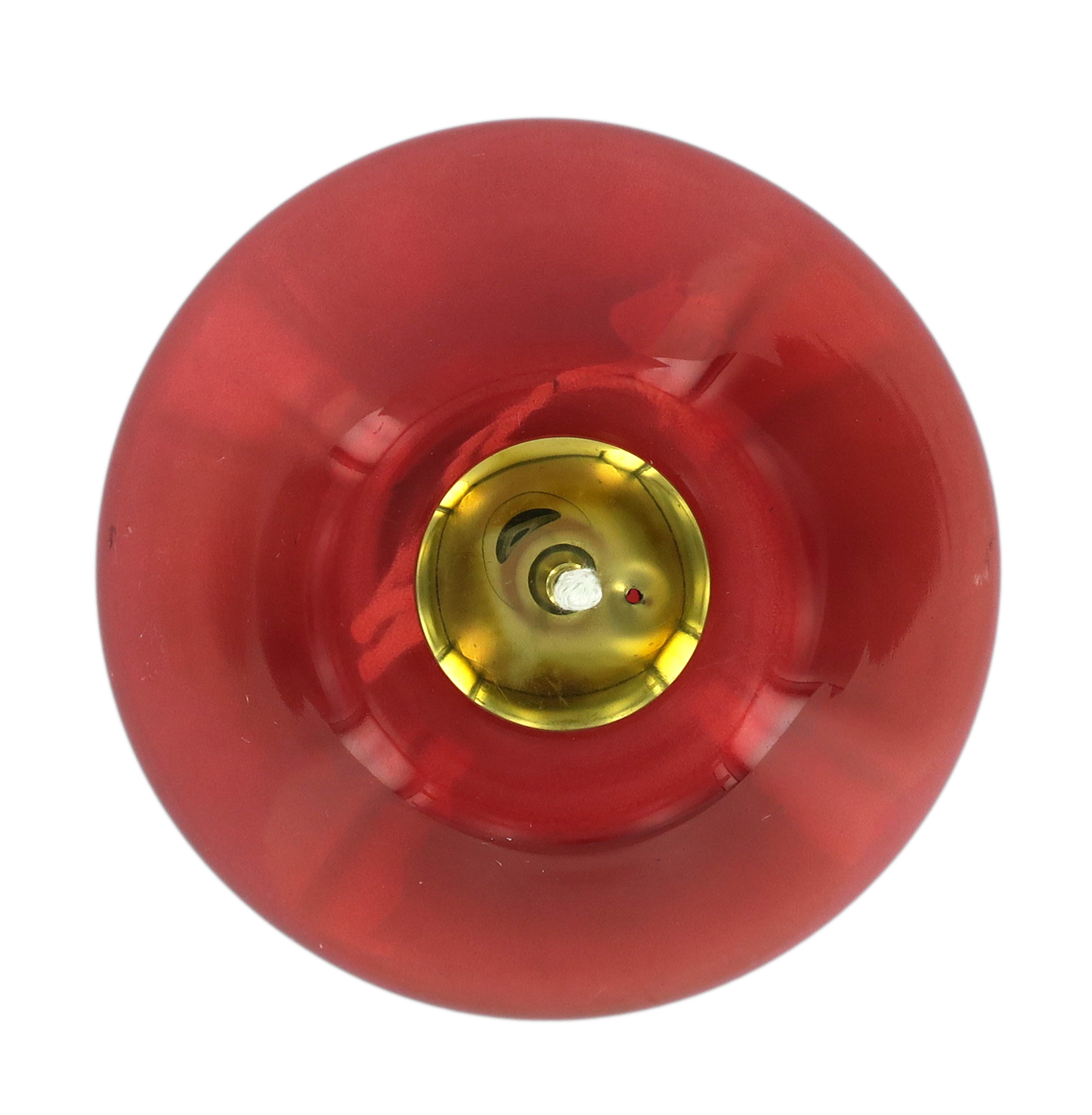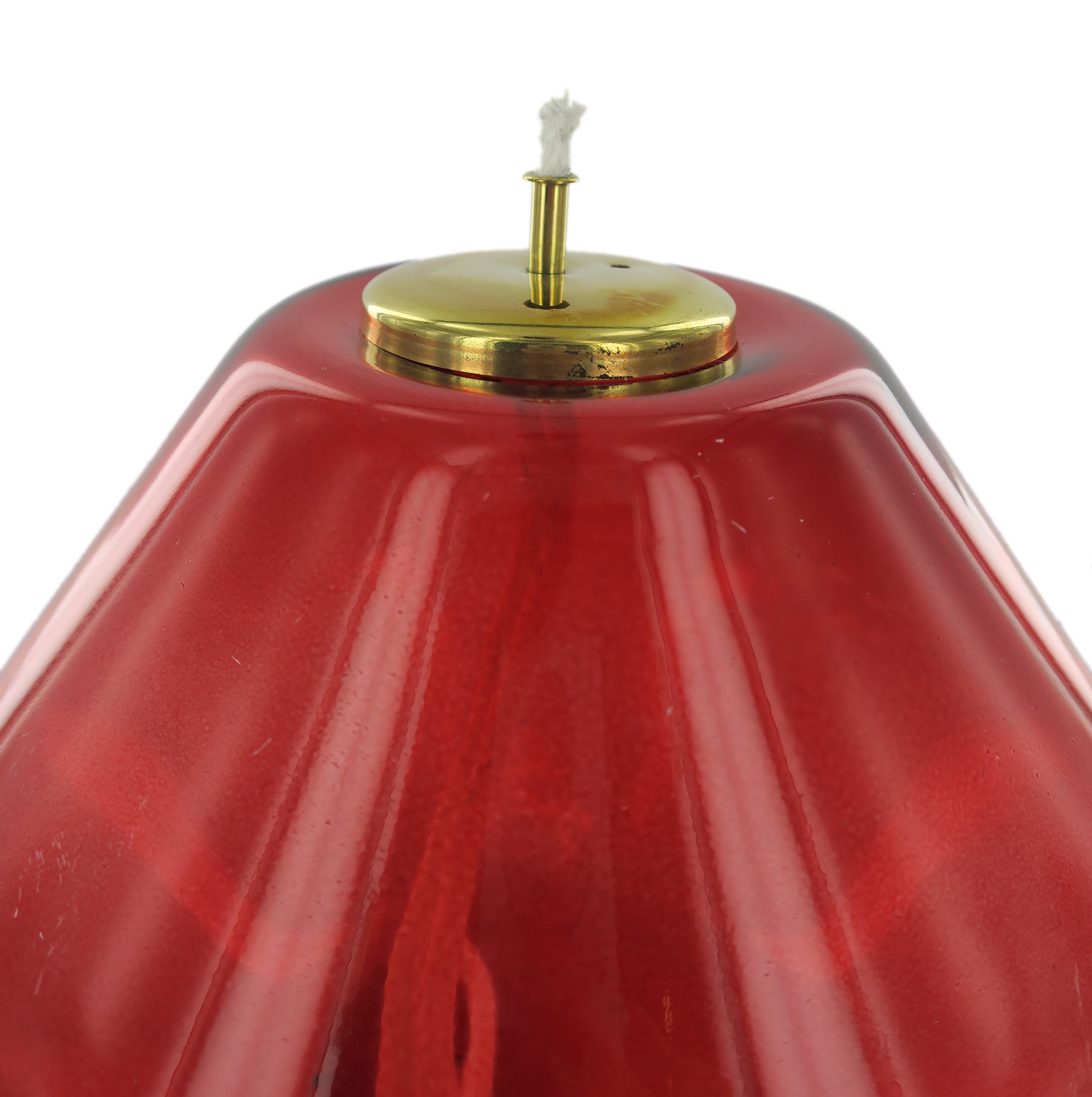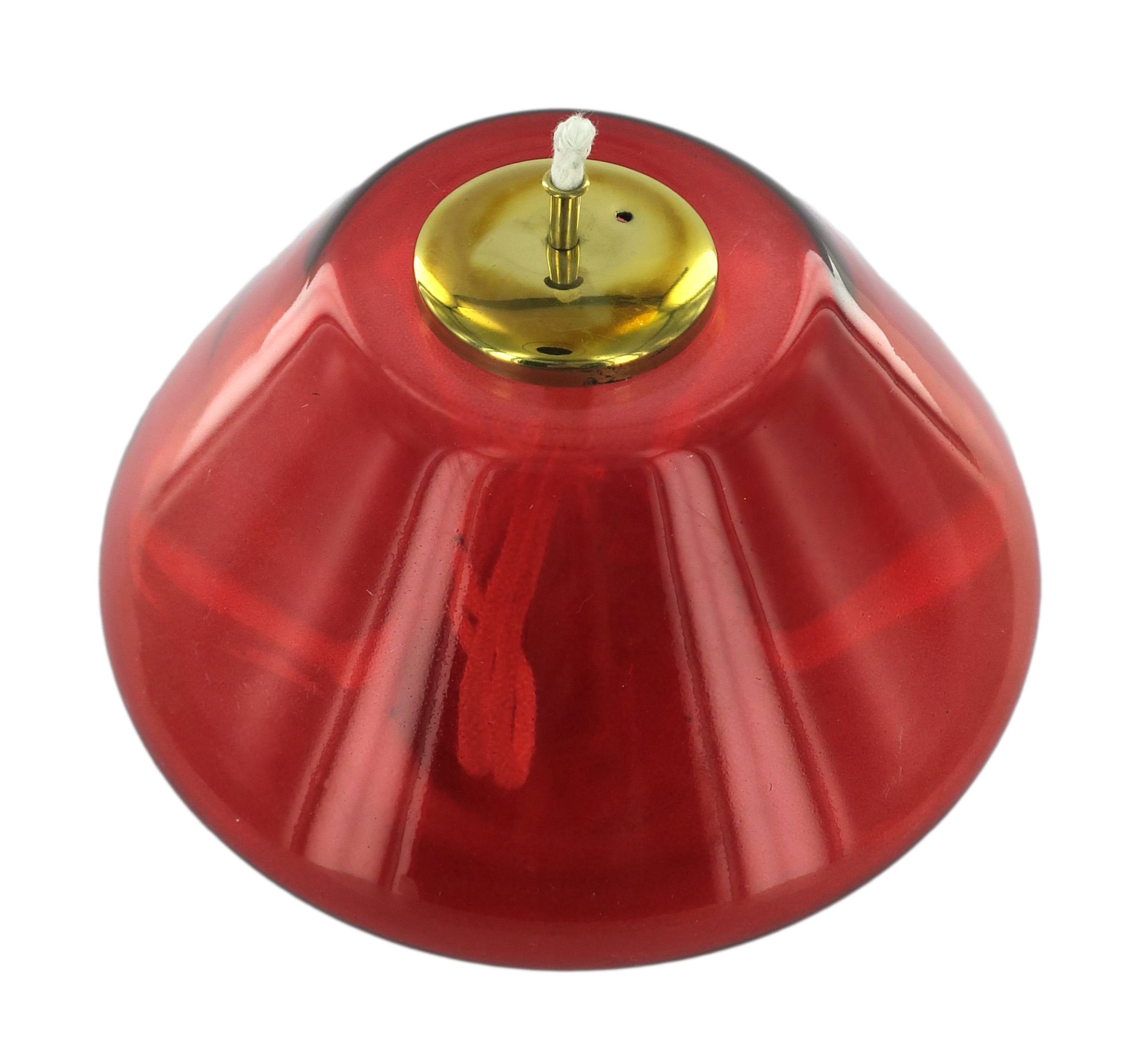 Lucerna in vetro rosso per uso liturgico. Adatta all'illuminazione di chiese e altari. Altezza 10 cm e diametro 14 cm. Completa di bocchello con stoppino.