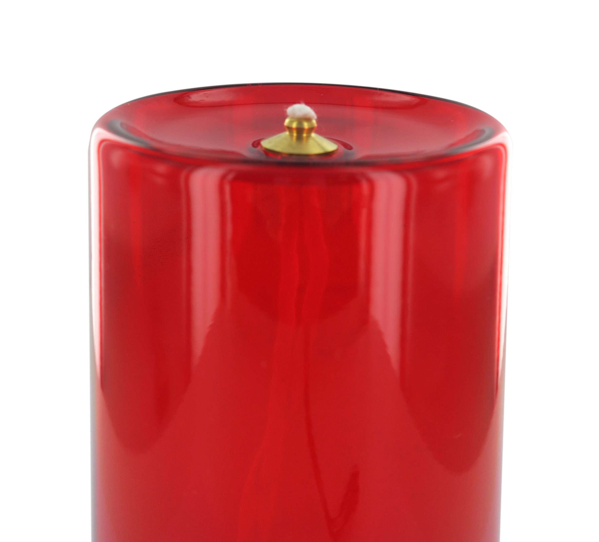 Vetro rosso integrato, con stoppino incorporato. Durata di 8 giorni e capienza di 700 cc.