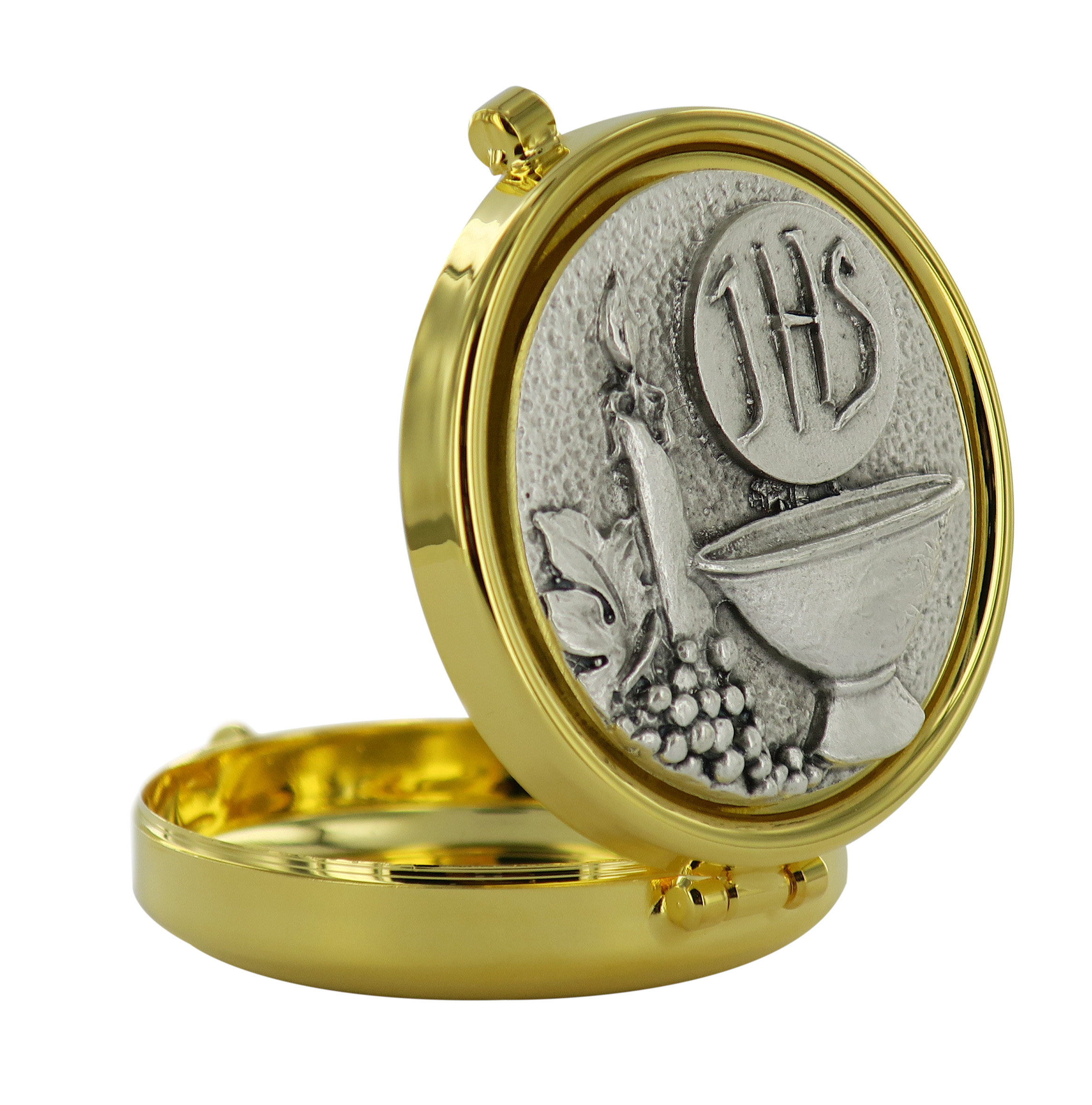 Teca eucaristica in ottone dorato con placca argentata sul coperchio con il rilievo di calice, uva, cero e ostia con JHS.