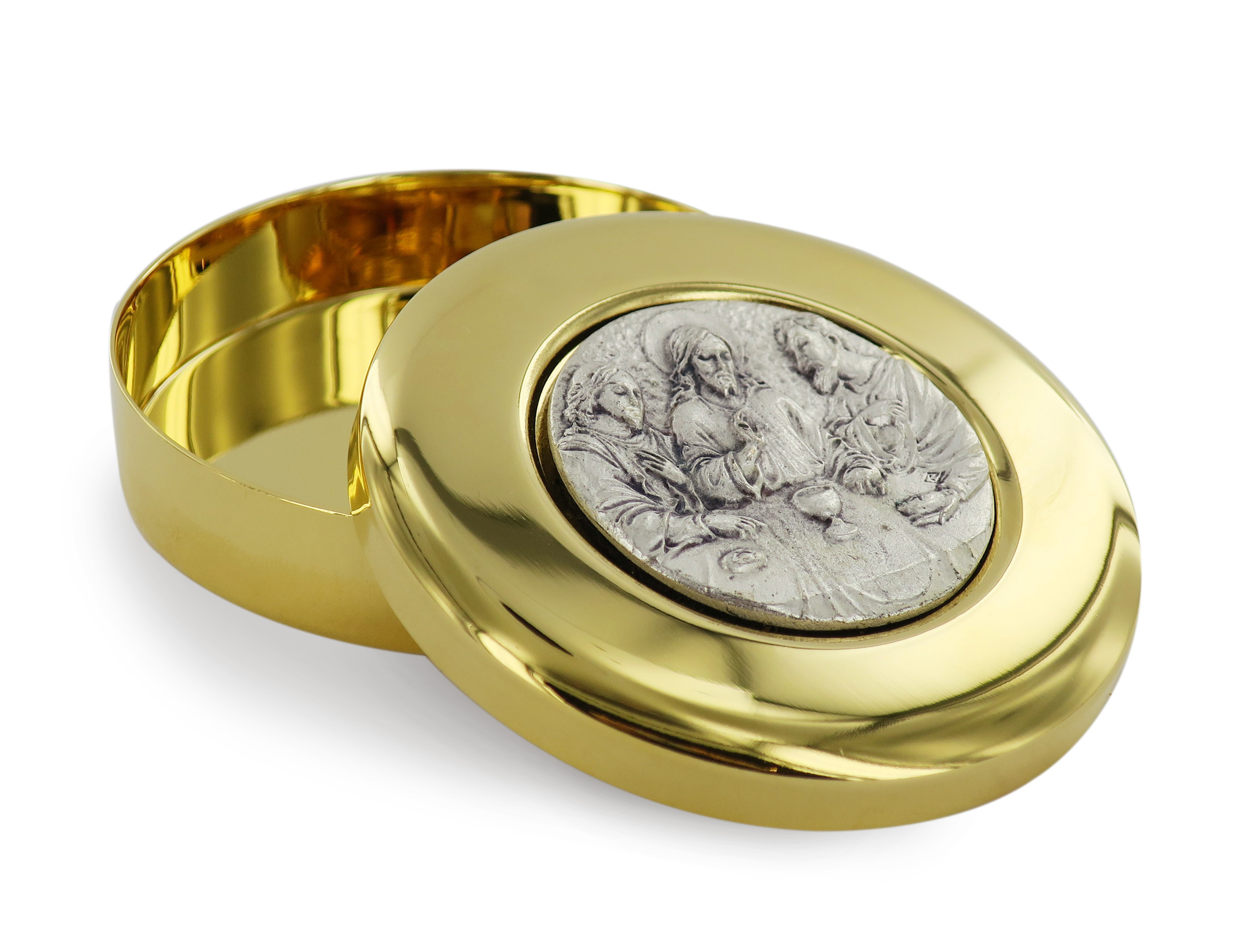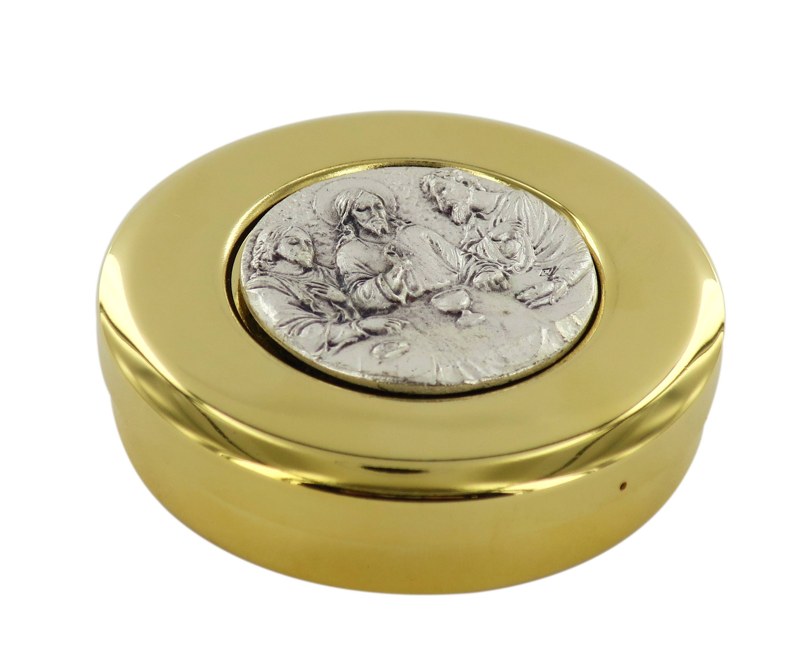 Teca eucaristica ostie in ottone dorato con placca ultima cena - Ø 7,5 cm