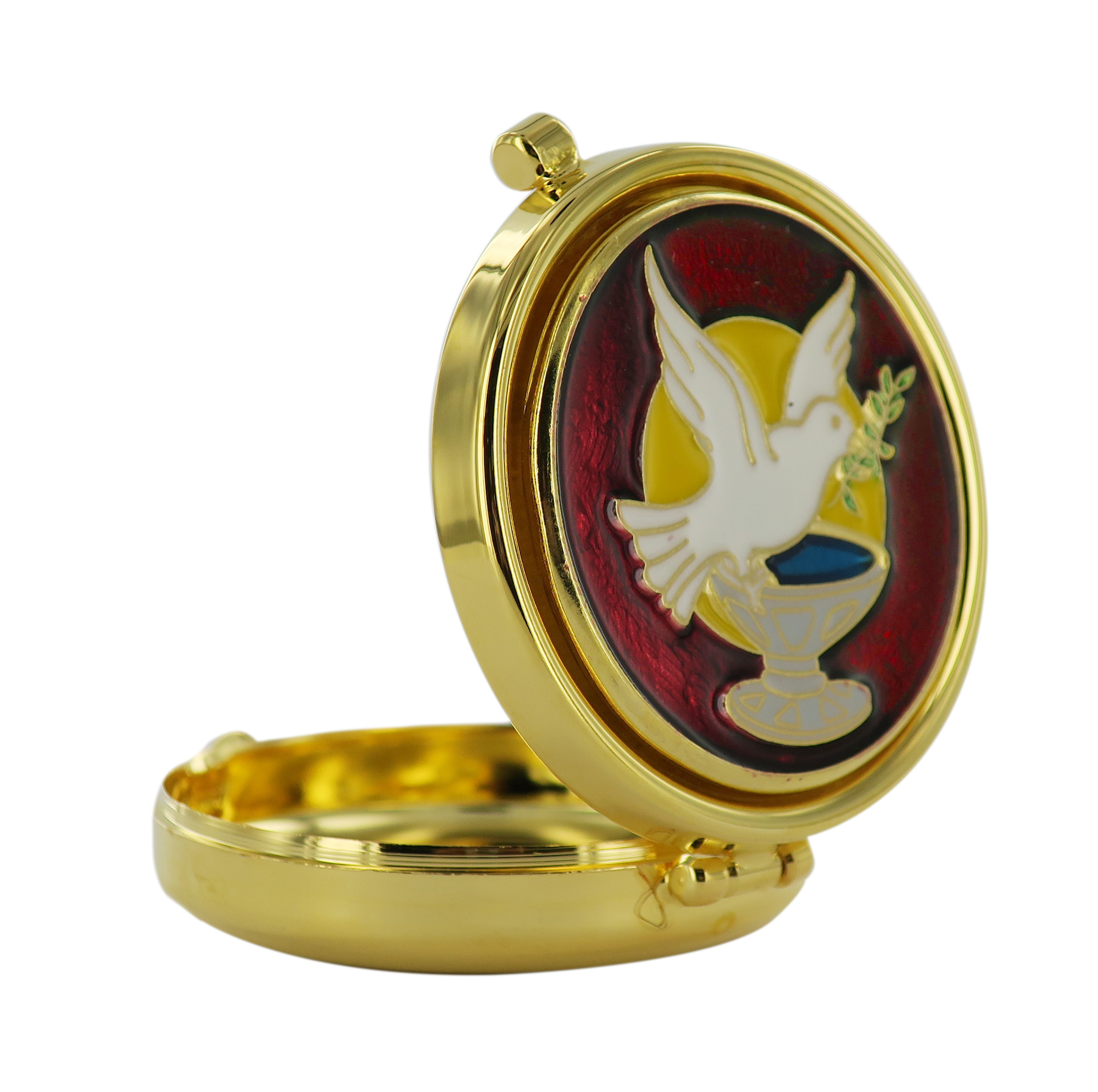 Teca eucaristica in metallo dorato, all'interno come all'esterno, con decorazioni di simboli eucaristici colomba e olivo, colorati e smaltati sul coperchio.