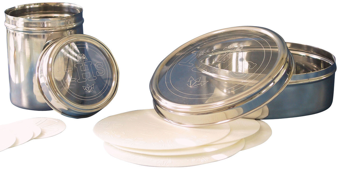 Scatola porta ostie Magna in acciaio inox, con chiusura ermetica e coperchio trasparente con scritta IHS. Contiene circa 50 ostie, oppure 1000 particole.